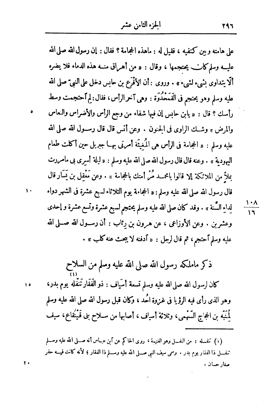 على هامته وبين كتفيه، فقيل له: ما هذه الحجامة؟ فقال: إن رسول الله صلّى الله عليه وسلّم كان يحتجمها، وقال: «من أهراق منه هذه الدماء فلا يضره ألّا يتداوى بشىء لشىء» . وروى: أن الأقرع بن حابس دخل على النبىّ صلّى الله عليه وسلّم وهو يحتجم فى القمحدوة: وهى آخر الرأس، فقال: لم احتجمت وسط رأسك؟ قال: «يابن حابس إن فيها شفاء من وجع الرأس والأضراس والنعاس والمرض» وشك الراوى فى الجنون. وعن أنس قال قال رسول الله صلّى الله عليه وسلّم: «الحجامة فى الرأس هى المغيثة أمرنى بها جبريل حين أكلت طعام اليهودية» . وعنه قال قال رسول الله صلّى الله عليه وسلّم: «ليلة أسرى بى ما مررت بملأ من الملائكة إلا قالوا يا محمد مر أمتك بالحجامة» . وعن معقل بن يسار قال قال رسول الله صلّى الله عليه وسلّم: «الحجامة يوم الثلاثاء لسبع عشرة فى الشهر دواء لداء السّنة» . وقد كان صلّى الله عليه وسلّم يحتجم لسبع عشرة وتسع عشرة وإحدى وعشرين. وعن الأوزاعى، عن هرون بن رئاب: أن رسول الله صلّى الله عليه وسلّم احتجم، ثم قال لرجل: «ادفنه لا يبحث عنه كلب» .