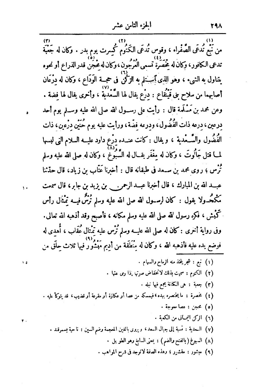 وعن محمد بن مسلمة قال: رأيت على رسول الله صلّى الله عليه وسلّم يوم أحد درعين، درعه ذات الفضول، ودرعه فضّة، ورأيت عليه يوم حنين درعين، ذات الفضول والسّعدية، ويقال: كانت عنده درع داود عليه السلام التى لبسها لما قتل جالوت، وكان له مغفر يقال له السّبوغ «8» ، وكان له صلّى الله عليه وسلّم ترس؛ روى محمد بن سعد فى طبقاته قال: أخبرنا عتّاب بن زياد، قال حدّثنا عبد الله بن المبارك، قال أخبرنا عبد الرحمن بن يزيد بن جابر، قال سمعت مكحولا يقول: كان لرسول الله صلّى الله عليه وسلّم ترس فيه تمثال رأس كبش، فكره رسول الله صلّى الله عليه وسلّم مكانه، فأصبح وقد أذهبه الله تعالى.