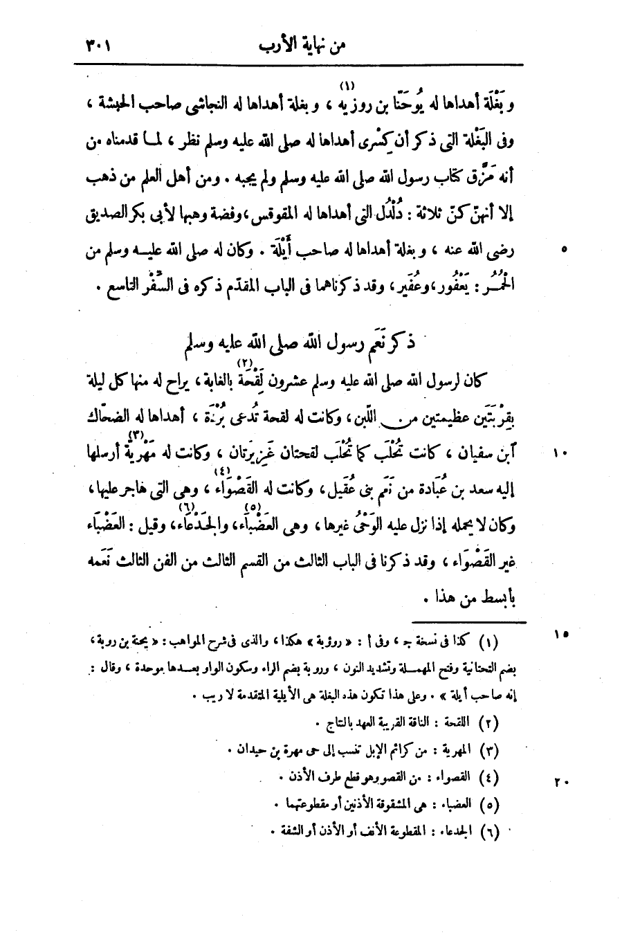 كان لرسول الله صلّى الله عليه وسلّم عشرون لقحة «2» بالغابة، يراح له منها كل ليلة بقربتين عظيمتين من اللّبن، وكانت له لقحة تدعى بردة، أهداها له الضحّاك ابن سفيان، كانت تحلب كما تحلب لقحتان غزيرتان، وكانت له مهريّة «3» أرسلها إليه سعد بن عبادة من نعم بنى عقيل، وكانت له القصواء «4» ، وهى التى هاجر عليها، وكان لا يحمله إذا نزل عليه الوحى غيرها، وهى العضباء «5» ، والجدعاء «6» ، وقيل: العضباء غير القصواء، وقد ذكرنا فى الباب الثالث من القسم الثالث من الفن الثالث نعمه بأبسط من هذا.