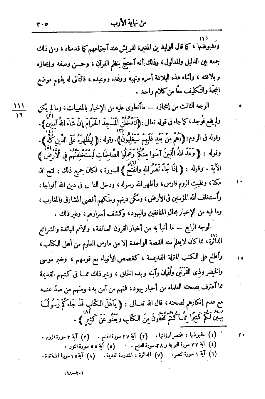 «6» السورة، فكان جميع ذلك: فتح الله مكة، وغلبت الروم فارس، وأظهر الله رسوله، ودخل الناس فى دين الله أفواجا، واستخلف الله المؤمنين فى الأرض، ومكّن دينهم وملّكهم أقصى المشارق والمغارب، وما فيه من الإخبار بحال المنافقين واليهود، وكشف أسرارهم، وغير ذلك.