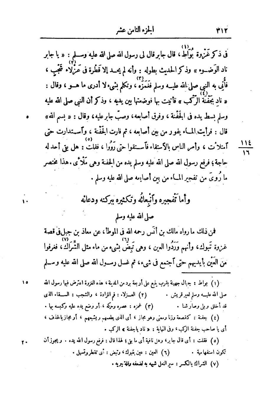 فى ذكر غزوة بواط «1» ، قال جابر قال لى رسول الله صلّى الله عليه وسلّم: «يا جابر ناد الوضوء» وذكر الحديث بطوله: وأنه لم يحد إلا قطرة فى عزلاء «2» شجب، فأتى به النبى صلّى الله عليه وسلّم فغمزه «3» ، وتكلم بشىء لا أدرى ما هو، وقال: