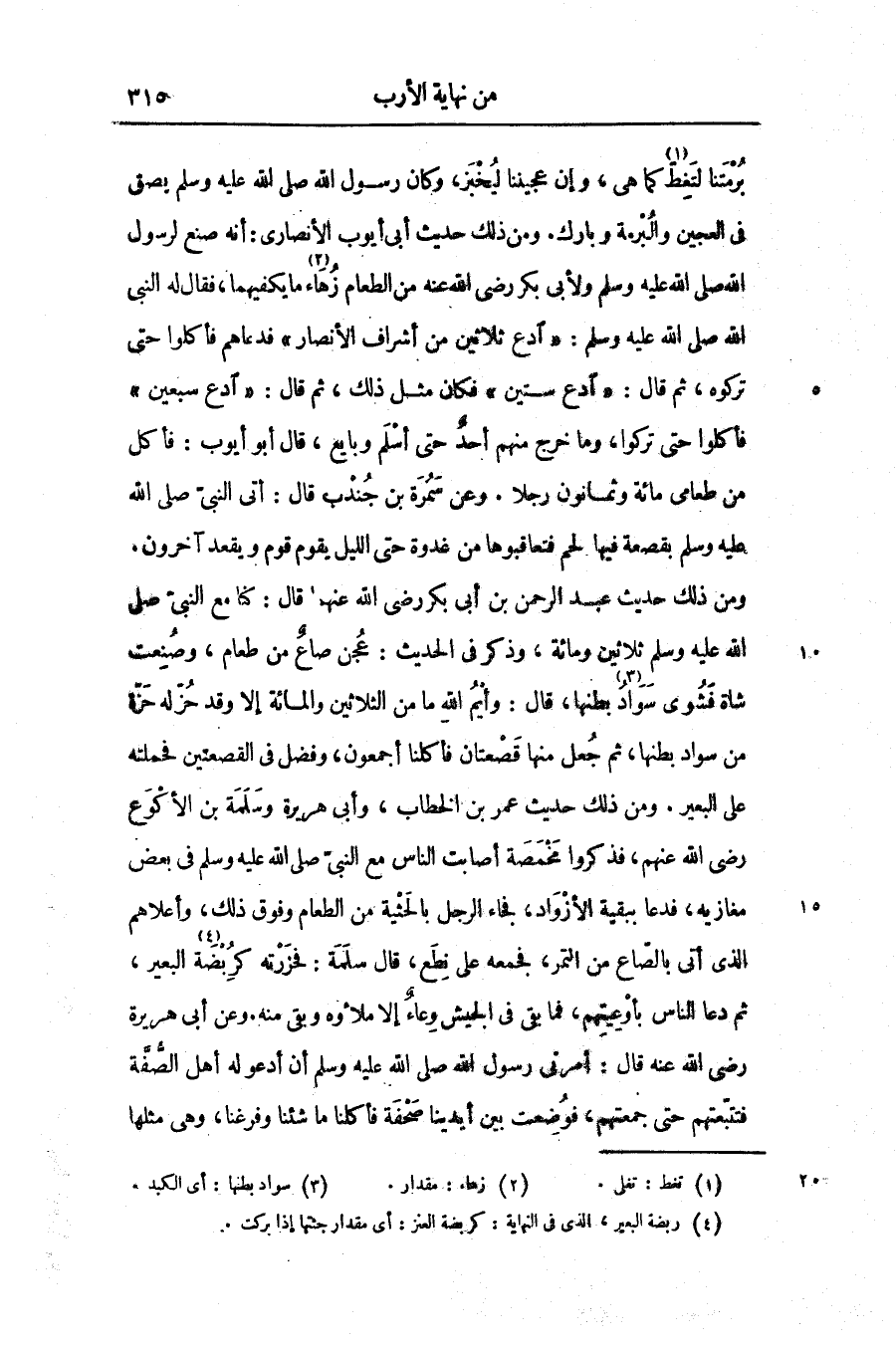 ومن ذلك حديث عبد الرحمن بن أبى بكر رضى الله عنهما قال: كنا مع النبىّ صلّى الله عليه وسلّم ثلاثين ومائة، وذكر فى الحديث: عجن صاع من طعام، وصنعت شاة فشوى سواد «3» بطنها، قال: وأيم الله ما من الثلاثين والمائة إلا وقد حزّله حزّة من سواد بطنها، ثم جعل منها قصعتان فأكلنا أجمعون، وفضل فى القصعتين فحملته على البعير. ومن ذلك حديث عمر بن الخطاب، وأبى هريرة وسلمة بن الأكوع رضى الله عنهم، فذكروا مخمصة أصابت الناس مع النبىّ صلّى الله عليه وسلّم فى بعض مغازيه، فدعا ببقية الأزواد، فجاء الرجل بالحثية من الطعام وفوق ذلك، وأعلاهم الذى أتى بالصّاع من التمر، فجمعه على نطع، قال سلمة: فحزرته كربضة «4» البعير، ثم دعا الناس بأوعيتهم، فما بقى فى الجيش وعاء إلا ملأوه وبقى منه. وعن أبى هريرة رضى الله عنه قال: أمرنى رسول الله صلّى الله عليه وسلّم أن أدعو له أهل الصّفّة فتتّبعتهم حتى جمعتهم، فوضعت بين أيدينا صحفة فأكلنا ما شئنا وفرغنا، وهى مثلها