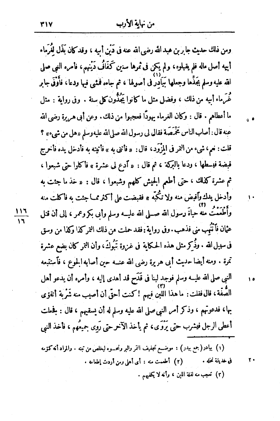 ومن ذلك حديث جابر بن عبد الله رضى الله عنه فى دين أبيه، وقد كان بذل لغرماء أبيه أصل ما له فلم يقبلوه، ولم يكن فى ثمرها سنين كفاف دينهم، فأمره النبى صلّى الله عليه وسلّم بجذّها وجعلها بيادر «1» في أصولها، ثم جاءه فمشى فيها ودعا، فأوفى جابر غرماء أبيه من ذلك، وفضل مثل ما كانوا يجذّون كل سنة. وفى رواية: مثل ما أعطاهم. قال: وكان الغرماء يهودا فعجبوا من ذلك. وعن أبى هريرة رضى الله عنه قال: أصاب الناس مخمصة فقال لى رسول الله صلّى الله عليه وسلّم «هل من شىء» ؟