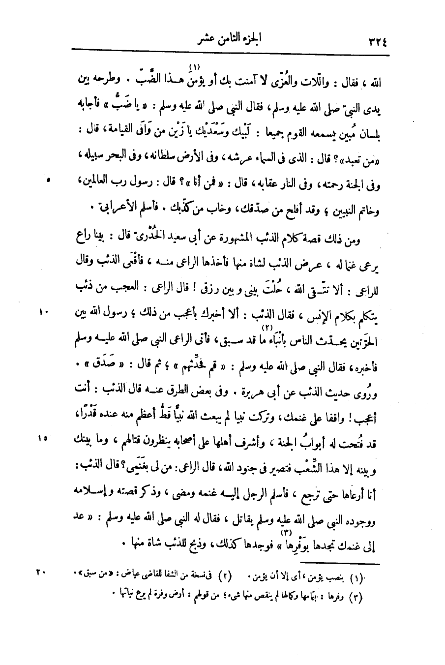 وروى حديث الذئب عن أبى هريرة. وفى بعض الطرق عنه قال الذئب: أنت أعجب! واقفا على غنمك، وتركت نبيا لم يبعث الله نبيّا قطّ أعظم منه عنده قدرا، قد فتحت له أبواب الجنة، وأشرف أهلها على أصحابه ينظرون قتالهم، وما بينك وبينه إلا هذا الشّعب فتصير فى جنود الله، قال الراعى: من لى بغنمى؟ قال الذئب: