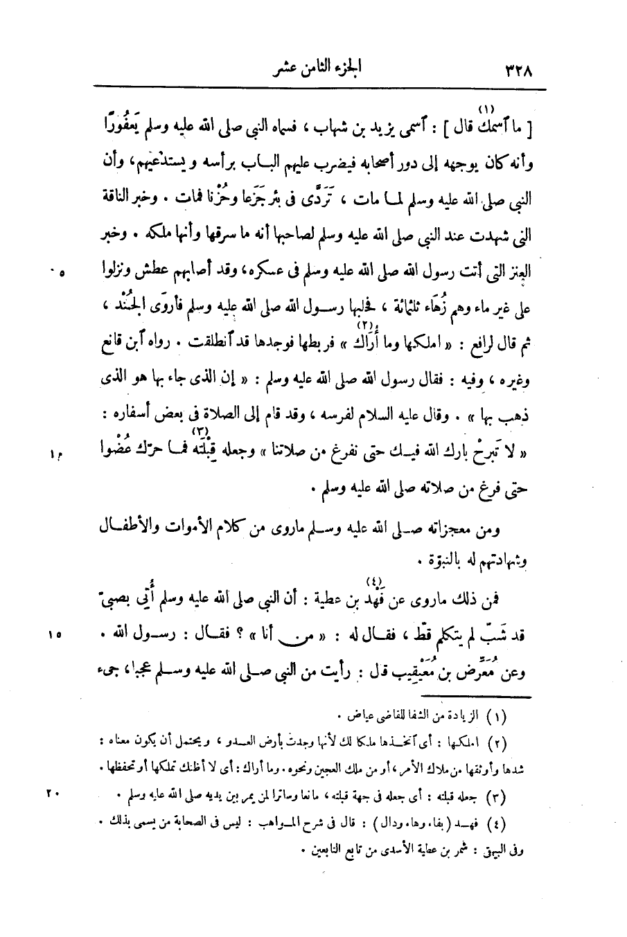 [ما اسمك «1» قال] : اسمى يزيد بن شهاب، فسماه النبى صلّى الله عليه وسلّم يعفورا وأنه كان يوجهه إلى دور أصحابه فيضرب عليهم الباب برأسه ويستدعيهم، وأن النبى صلّى الله عليه وسلّم لما مات، تردّى فى بئر جزعا وحزنا فمات. وخبر الناقة التى شهدت عند النبى صلّى الله عليه وسلّم لصاحبها أنه ما سرقها وأنها ملكه. وخبر العنز التى أتت رسول الله صلّى الله عليه وسلّم فى عسكره، وقد أصابهم عطش ونزلوا على غير ماء وهم زهاء ثلاثمائة، فحلبها رسول الله صلّى الله عليه وسلّم فأروى الجند، ثم قال لرافع: «املكها وما أراك «2» » فربطها فوجدها قد انطلقت. رواه ابن قانع وغيره، وفيه: فقال رسول الله صلّى الله عليه وسلّم: «إن الذى جاء بها هو الذى ذهب بها» . وقال عليه السلام لفرسه، وقد قام إلى الصلاة فى بعض أسفاره: