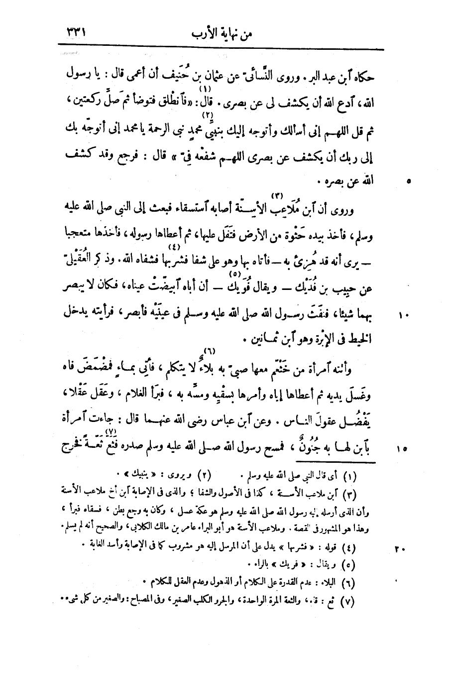 حكاه ابن عبد البر. وروى النّسائىّ عن عثمان بن حنيف أن أعمى قال: يا رسول الله، ادع الله أن يكشف لى عن بصرى. قال «1» : «فانطلق فتوضأ ثم صلّ ركعتين، ثم قل اللهم إنى أسألك وأتوجه إليك بنبيّى «2» محمد نبى الرحمة يا محمد إنى أتوجّه بك إلى ربك أن يكشف عن بصرى اللهم شفعه فىّ» قال: فرجع وقد كشف الله عن بصره.