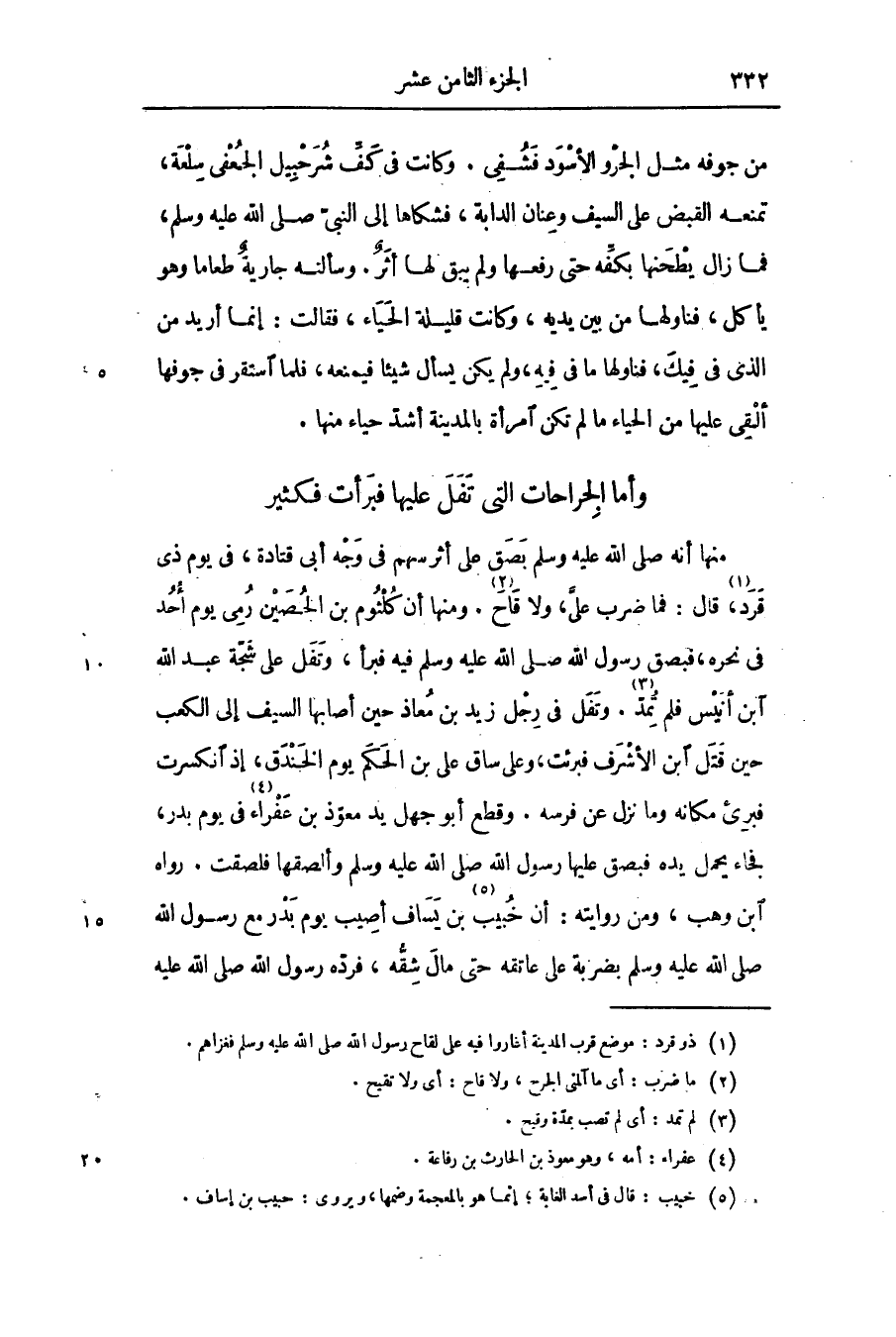منها أنه صلّى الله عليه وسلّم بصق على أثر سهم فى وجه أبى قتادة، فى يوم ذى قرد «1» ، قال: فما ضرب علىّ، ولا قاح «2» . ومنها أن كلثوم بن الحصين رمى يوم أحد فى نحره، فبصق رسول الله صلّى الله عليه وسلّم فيه فبرأ، وتفل على شجّة عبد الله ابن أنيس فلم تمدّ «3» . وتفل فى رجل زيد بن معاذ حين أصابها السيف إلى الكعب حين قتل ابن الأشرف فبرئت، وعلى ساق على بن الحكم يوم الخندق، إذ انكسرت فبرئ مكانه وما نزل عن فرسه. وقطع أبو جهل يد معوّذ بن عفراء «4» في يوم بدر، فجاء يحمل يده فبصق عليها رسول الله صلّى الله عليه وسلّم وألصقها فلصقت. رواه ابن وهب، ومن روايته: أن خبيب «5» بن يساف أصيب يوم بدر مع رسول الله صلّى الله عليه وسلّم بضربة على عاتقه حتى مال شقّه، فردّه رسول الله صلّى الله عليه
