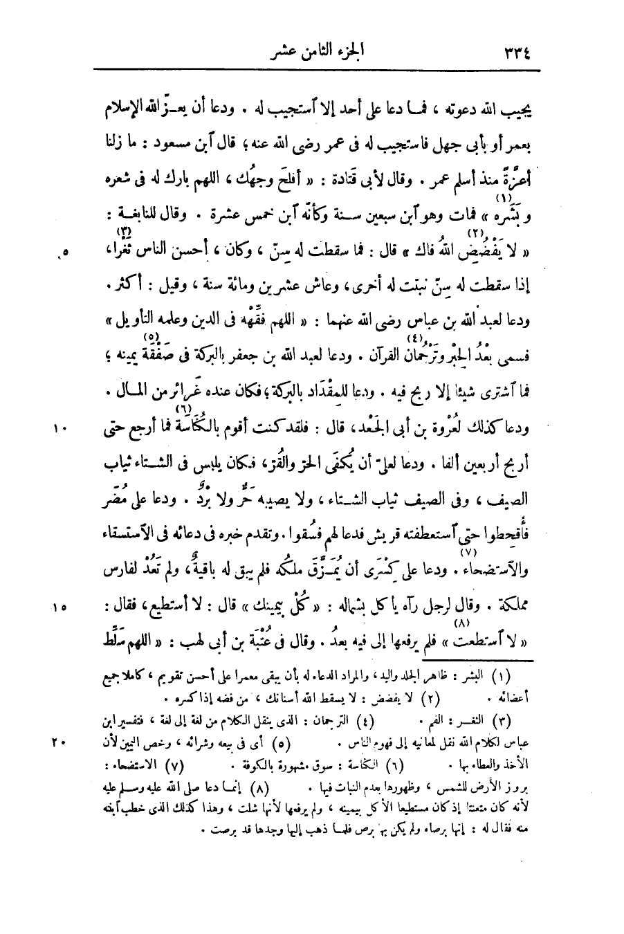 ودعا كذلك لعروة بن أبى الجعد، قال: فلقد كنت أقوم بالكناسة «6» فما أرجع حتى أربح أربعين ألفا. ودعا لعلىّ أن يكفى الحرّ والقرّ، فكان يلبس فى الشتاء ثياب الصيف، وفى الصيف ثياب الشتاء، ولا يصيبه حرّ ولا برد. ودعا على مضر فأقحطوا حتى استعطفته قريش فدعا لهم فسقوا. وتقدم خبره فى دعائه فى الاستسقاء والاستضحاء «7» . ودعا على كسرى أن يمزّق ملكه فلم يبق له باقية، ولم تعد لفارس مملكة. وقال لرجل رآه يأكل بشماله: «كل بيمينك» قال: لا أستطيع، فقال: