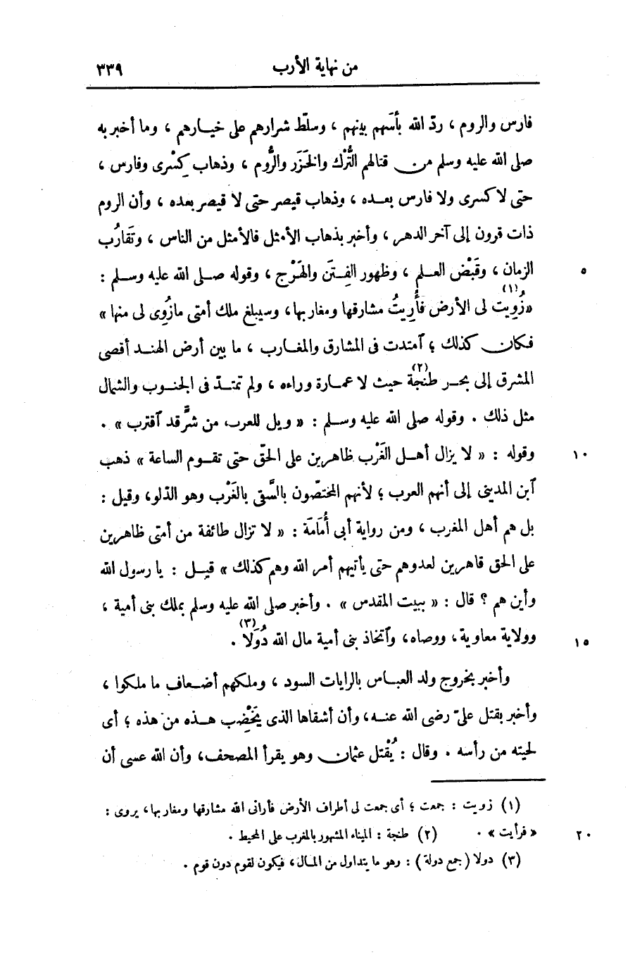 «زويت «1» لى الأرض فأريت مشارقها ومغاربها، وسيبلغ ملك أمتى ما زوى لى منها» فكان كذلك؛ امتدت فى المشارق والمغارب، ما بين أرض الهند أقصى المشرق إلى بحر طنجة «2» حيث لا عمارة وراءه، ولم تمتدّ فى الجنوب والشمال مثل ذلك. وقوله صلّى الله عليه وسلّم: «ويل للعرب من شرّ قد اقترب» .