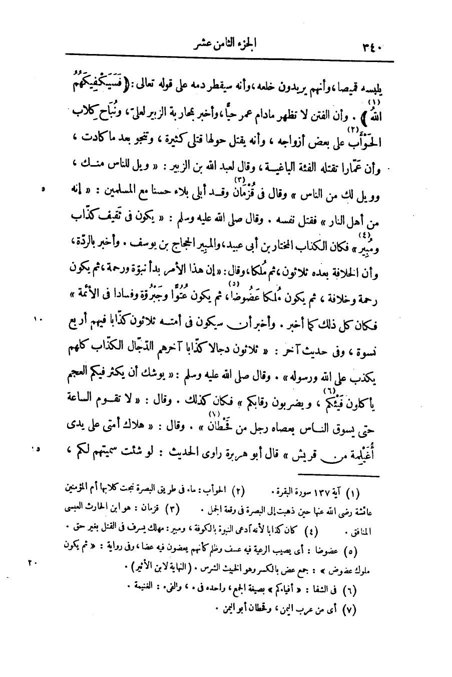 «1» . وأن الفتن لا تظهر مادام عمر حيّا، وأخبر بمحاربة الزبير لعلىّ، ونباح كلاب الحوأب «2» على بعض أزواجه، وأنه يقتل حولها قتلى كثيرة، وتنجو بعد ما كادت، وأن عمّارا تقتله الفئة الباغية، وقال لعبد الله بن الزبير: «ويل للناس منك، وويل لك من الناس» وقال فى قزمان «3» وقد أبلى بلاء حسنا مع المسلمين: «إنه من أهل النار» فقتل نفسه. وقال صلّى الله عليه وسلّم: «يكون فى ثقيف كذّاب ومبير «4» » فكان الكذاب المختار بن أبى عبيد، والمبير الحجاج بن يوسف. وأخبر بالردّة، وأن الخلافة بعده ثلاثون، ثم ملكا، وقال: «إن هذا الأمر بدأ نبوّة ورحمة، ثم يكون رحمة وخلافة، ثم يكون ملكا عضوضا «5» ، ثم يكون عتوّا وجبروّة وفسادا فى الأئمة» فكان كل ذلك كما أخبر. وأخبر أن سيكون فى أمته ثلاثون كذّابا فيهم أربع نسوة، وفى حديث آخر: «ثلاثون دجالا كذّابا آخرهم الدّجّال الكذّاب كلهم يكذب على الله ورسوله» . وقال صلّى الله عليه وسلّم: «يوشك أن يكثر فيكم العجم يأكلون فيئكم «6» ، ويضربون رقابكم» فكان كذلك. وقال: «لا تقوم الساعة حتى يسوق الناس بعصاه رجل من قحطان» «7» . وقال: «هلاك أمتى على يدى أغيلمة من قريش» قال أبو هريرة راوى الحديث: لو شئت سميتهم لكم،