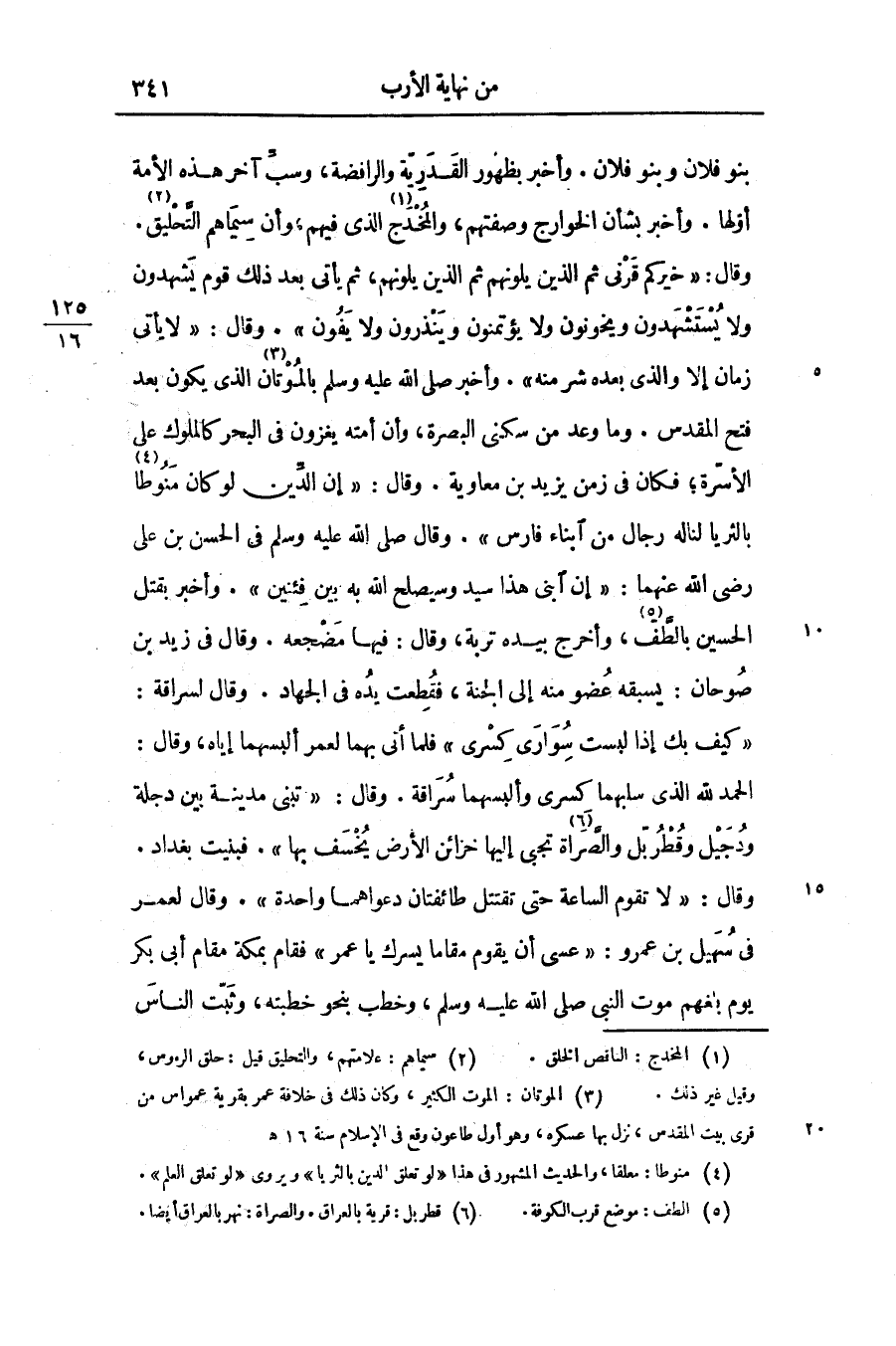 وقال: «خيركم قرنى ثم الذين يلونهم ثم الذين يلونهم، ثم يأتى بعد ذلك قوم يشهدون ولا يستشهدون ويخونون ولا يؤتمنون وينذرون ولا يفون» . وقال: «لا يأتى زمان إلا والذى بعده شر منه» . وأخبر صلّى الله عليه وسلّم بالموتان «3» الذى يكون بعد فتح المقدس. وما وعد من سكنى البصرة، وأن أمته يغزون فى البحر كالملوك على الأسرّة؛ فكان فى زمن يزيد بن معاوية. وقال: «إن الدّين لو كان منوطا «4» بالثريا لناله رجال من ابناء فارس» . وقال صلّى الله عليه وسلّم فى الحسن بن على رضى الله عنهما: «إن ابنى هذا سيد وسيصلح الله به بين فئتين» . وأخبر بقتل الحسين بالطّف «5» ، وأخرج بيده تربة، وقال: فيها مضجعه. وقال فى زيد بن صوحان: يسبقه عضو منه إلى الجنة، فقطعت يده فى الجهاد. وقال لسراقة: