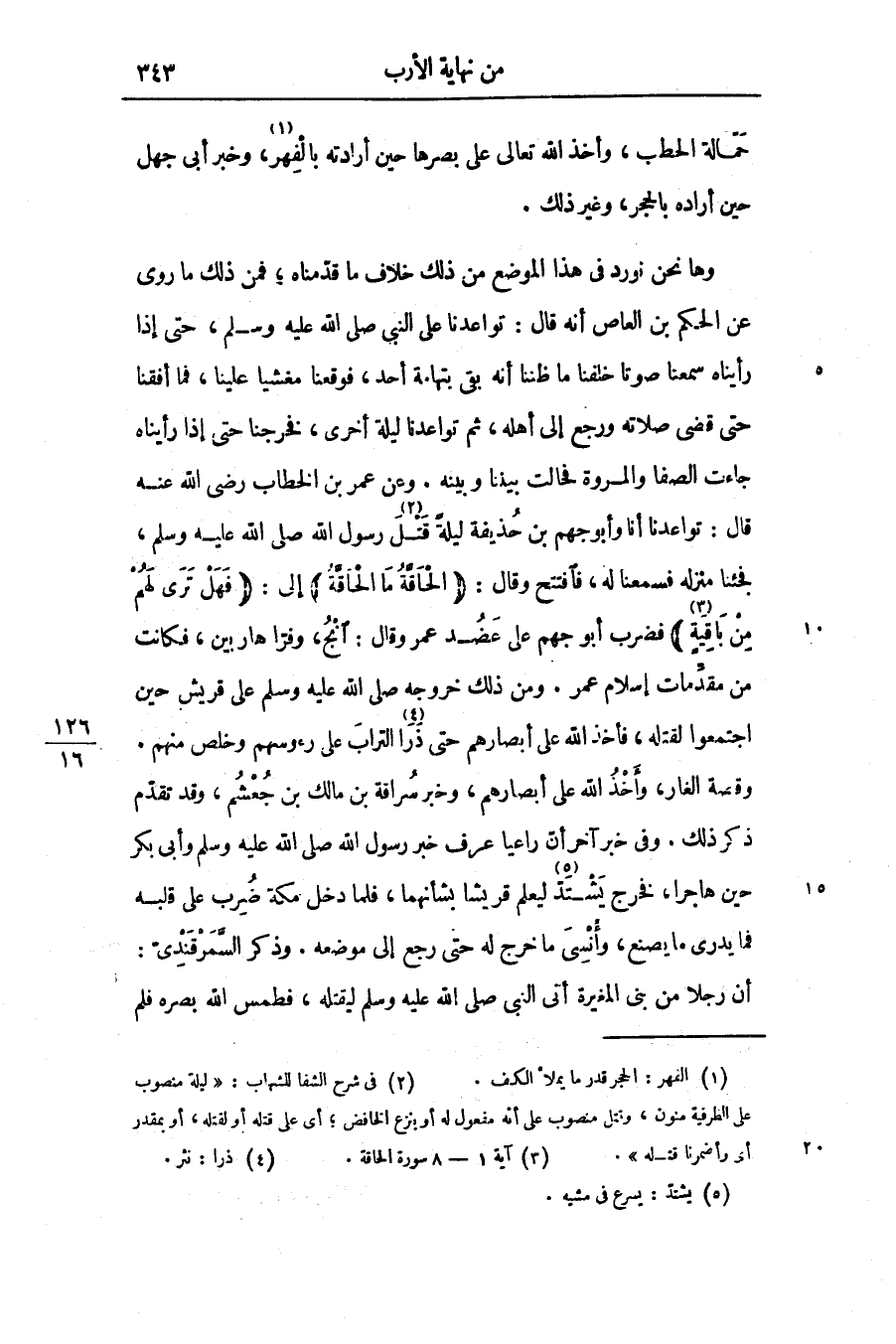 وها نحن نورد فى هذا الموضع من ذلك خلاف ما قدّمناه؛ فمن ذلك ما روى عن الحكم بن العاص أنه قال: تواعدنا على النبى صلّى الله عليه وسلّم، حتى إذا رأيناه سمعنا صوتا خلفنا ما ظننا أنه بقى بتهامة أحد، فوقعنا مغشيا علينا، فما أفقنا حتى قضى صلاته ورجع إلى أهله، ثم تواعدنا ليلة أخرى، فخرجنا حتى إذا رأيناه جاءت الصفا والمروة فحالت بيننا وبينه. وعن عمر بن الخطاب رضى الله عنه قال: تواعدنا أنا وأبو جهم بن حذيفة ليلة قتل «2» رسول الله صلّى الله عليه وسلّم، فجئنا منزله فسمعنا له، فافتتح وقال: الْحَاقَّةُ مَا الْحَاقَّةُ