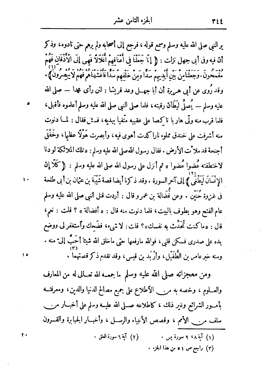 وقد روى عن أبى هريرة أن أبا جهل وعد قريشا: لئن رأى محمدا- صلى الله عليه وسلّم- يصلّى ليطأنّ رقبته، فلما صلّى النبى صلى الله عليه وسلّم أعلموه فأقبل، فلما قرب منه ولّى هاربا ناكصا على عقبيه متّقيا بيديه، فسئل فقال: لما دنوت منه أشرفت على خندق مملوء نارا كدت أهوى فيه، وأبصرت هولا عظيما، وخفق أجنحة قد ملأت الأرض. فقال رسول الله صلّى الله عليه وسلّم: «تلك الملائكة لودنا لا ختطفته عضوا عضوا» ثم أنزل على رسول الله صلّى الله عليه وسلّم: كَلَّا إِنَّ الْإِنْسانَ لَيَطْغى