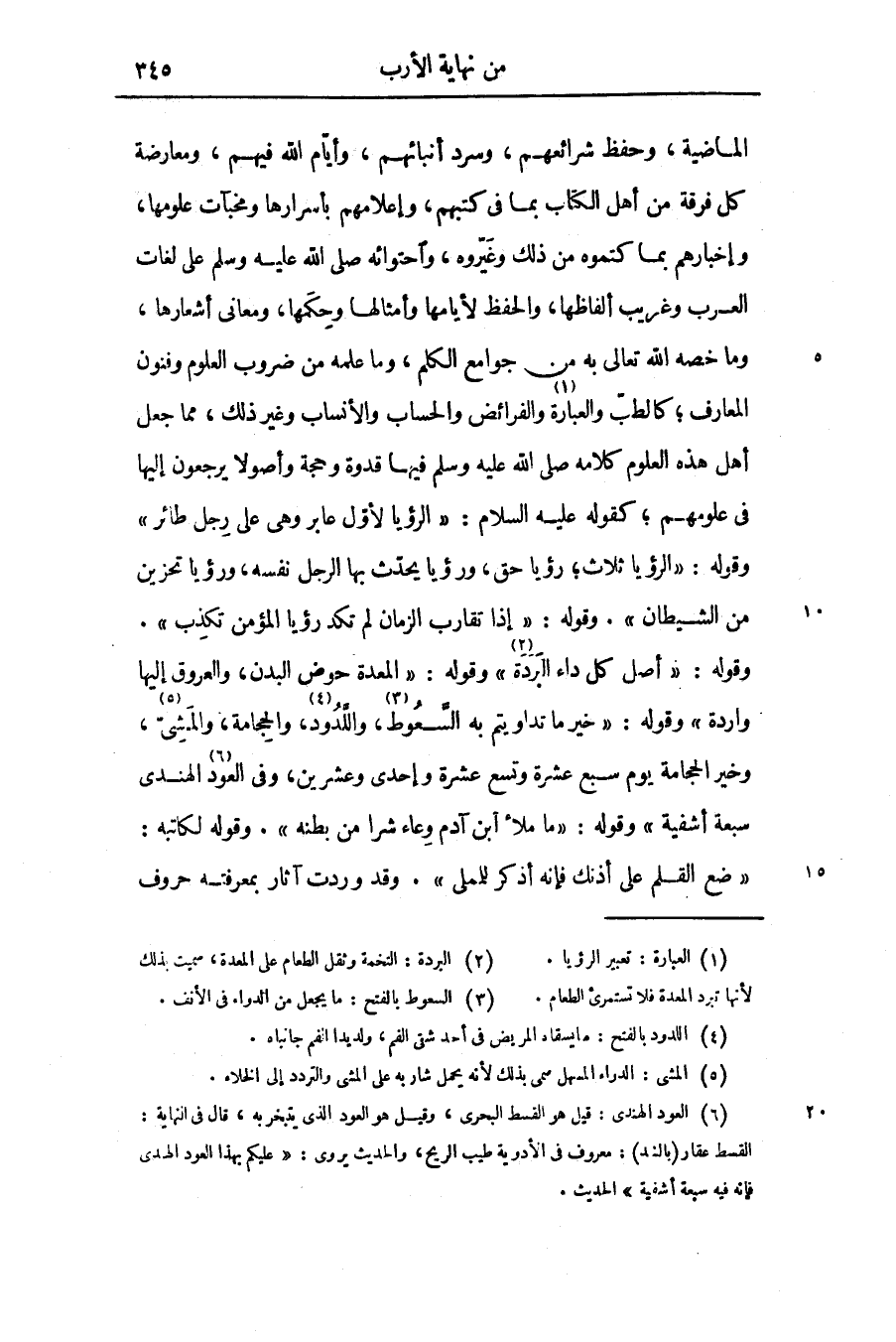 الماضية، وحفظ شرائعهم، وسرد أنبائهم، وأيّام الله فيهم، ومعارضة كل فرقة من أهل الكتاب بما فى كتبهم، وإعلامهم بأسرارها ومخبآت علومها، وإخبارهم بما كتموه من ذلك وغيّروه، واحتوائه صلّى الله عليه وسلّم على لغات العرب وغريب ألفاظها، والحفظ لأيامها وأمثالها وحكمها، ومعانى أشعارها، وما خصه الله تعالى به من جوامع الكلم، وما علمه من ضروب العلوم وفنون المعارف؛ كالطبّ والعبارة «1» والفرائض والحساب والأنساب وغير ذلك، مما جعل أهل هذه العلوم كلامه صلّى الله عليه وسلّم فيها قدوة وحجة وأصولا يرجعون إليها فى علومهم؛ كقوله عليه السلام: «الرؤيا لأوّل عابر وهى على رجل طائر» وقوله: «الرؤيا ثلاث؛ رؤيا حق، ورؤيا يحدّث بها الرجل نفسه، ورؤيا تحزين من الشيطان» . وقوله: «إذا تقارب الزمان لم تكد رؤيا المؤمن تكذب» .