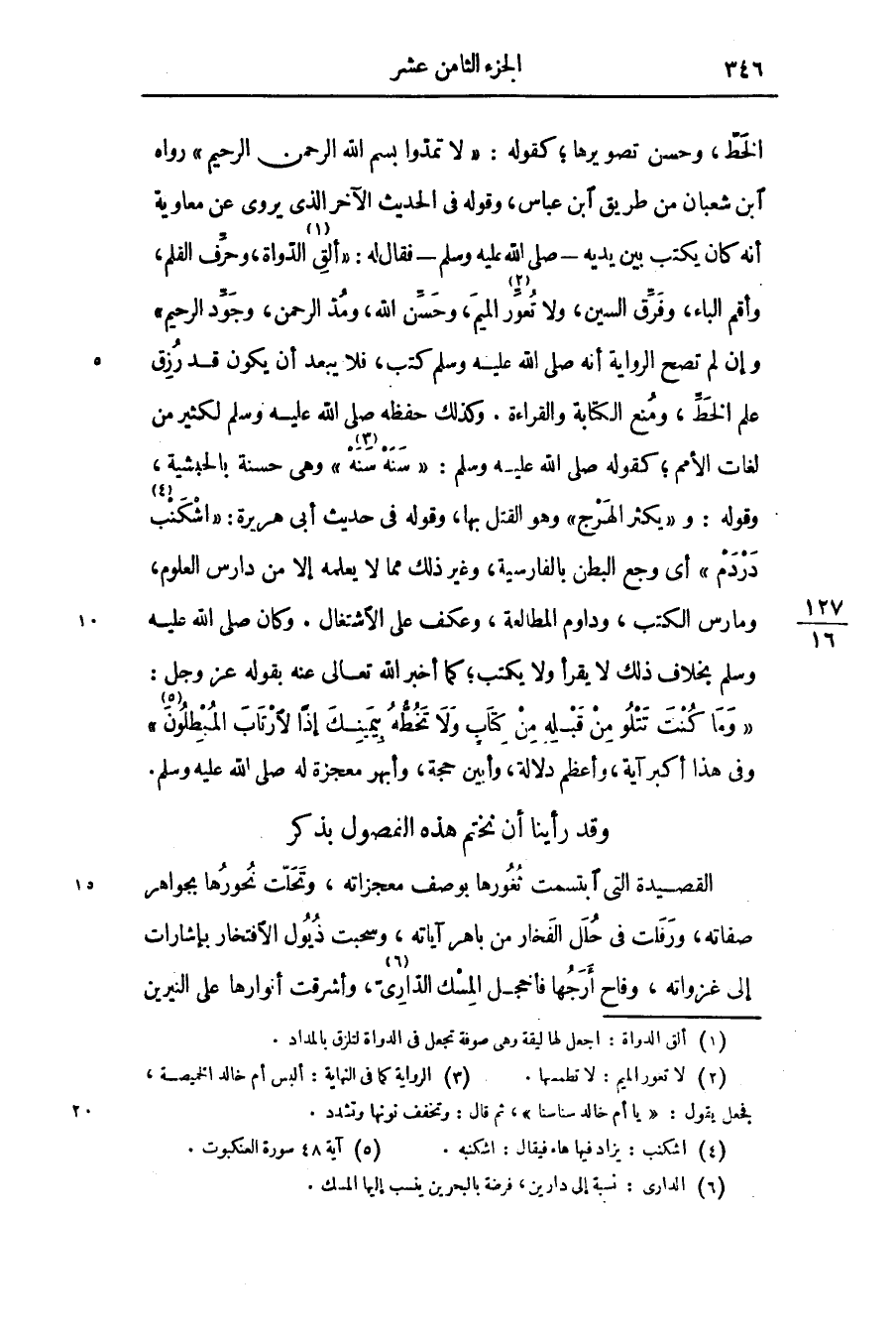 الخطّ، وحسن تصويرها؛ كقوله: «لا تمدّوا بسم الله الرحمن الرحيم» رواه ابن شعبان من طريق ابن عباس، وقوله فى الحديث الآخر الذى يروى عن معاوية أنه كان يكتب بين يديه- صلى الله عليه وسلّم- فقال له: «ألق «1» الدّواة، وحرّف القلم، وأقم الباء، وفرّق السين، ولا تعوّر «2» الميم، وحسّن الله، ومدّ الرحمن، وجوّد الرحيم» وإن لم تصح الرواية أنه صلّى الله عليه وسلّم كتب، فلا يبعد أن يكون قد رزق علم الخطّ، ومنع الكتابة والقراءة. وكذلك حفظه صلّى الله عليه وسلّم لكثير من لغات الأمم؛ كقوله صلّى الله عليه وسلّم: «سنه سنه «3» » وهى حسنة بالحبشية، وقوله: و «يكثر الهرج» وهو القتل بها، وقوله فى حديث أبى هريرة: «اشكنب «4» دردم» أى وجع البطن بالفارسية، وغير ذلك مما لا يعلمه إلا من دارس العلوم، ومارس الكتب، وداوم المطالعة، وعكف على الاشتغال. وكان صلّى الله عليه وسلّم بخلاف ذلك لا يقرأ ولا يكتب؛ كما أخبر الله تعالى عنه بقوله عز وجل: