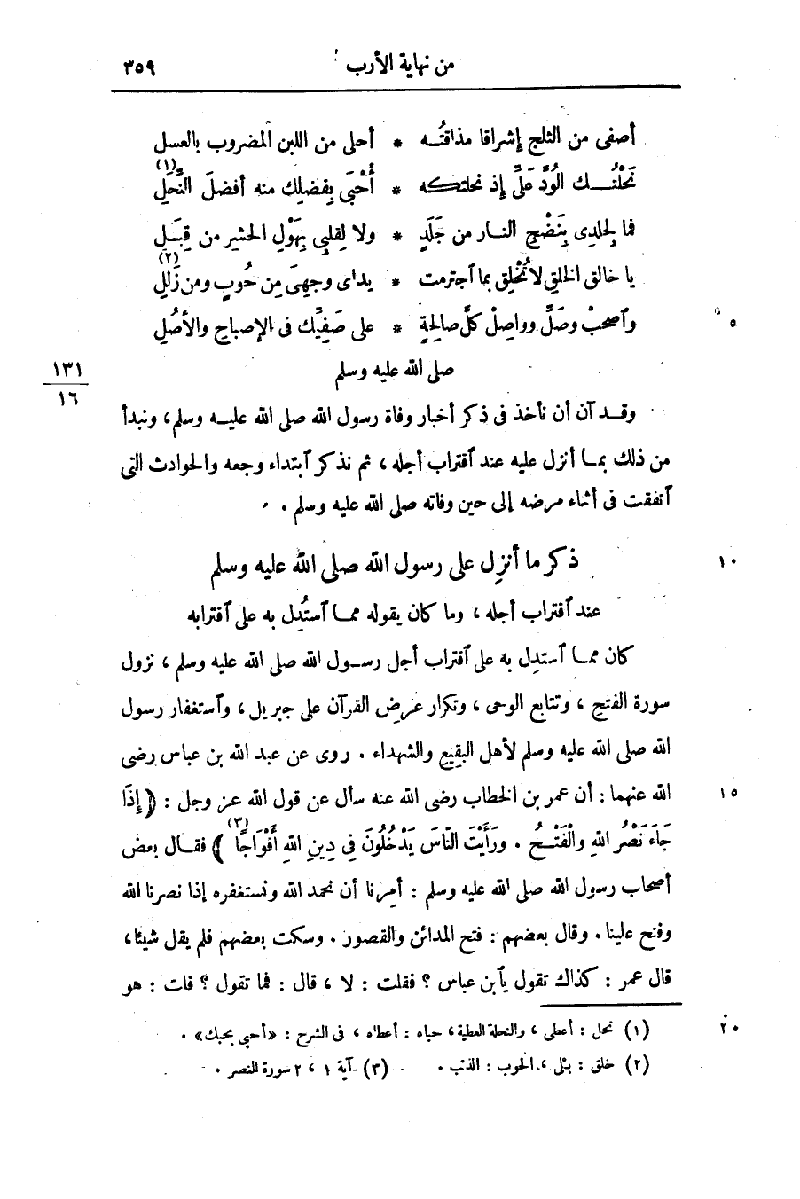 صلّى الله عليه وسلّم وقد آن أن نأخذ فى ذكر أخبار وفاة رسول الله صلّى الله عليه وسلّم، ونبدأ من ذلك بما أنزل عليه عند اقتراب أجله، ثم نذكر ابتداء وجعه والحوادث التى انفقت فى أثناء مرضه إلى حين وفاته صلّى الله عليه وسلّم.