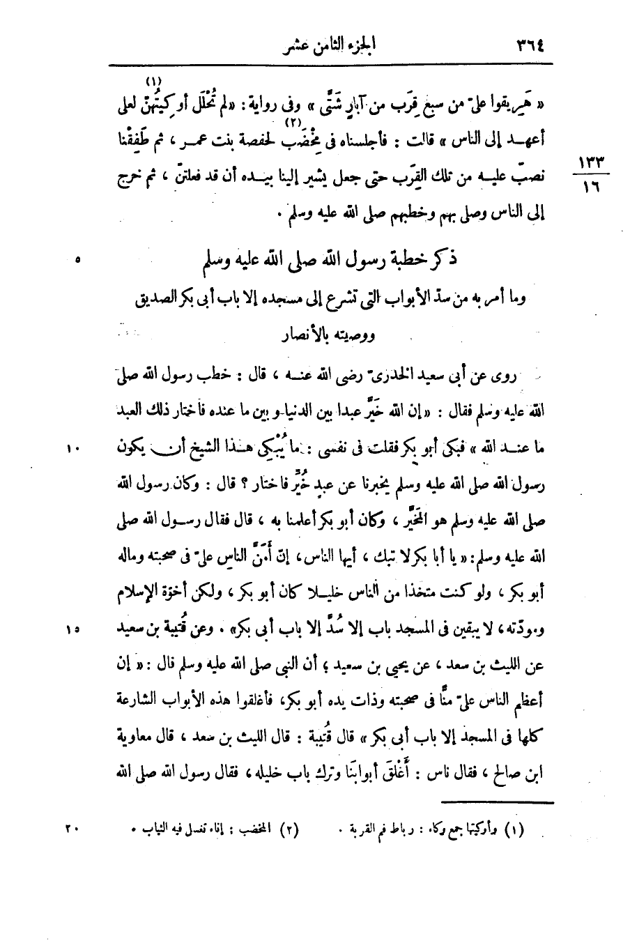 روى عن أبى سعيد الخدرىّ رضى الله عنه، قال: خطب رسول الله صلّى الله عليه وسلّم فقال: «إن الله خيّر عبدا بين الدنيا وبين ما عنده فاختار ذلك العبد ما عند الله» فبكى أبو بكر فقلت فى نفسى: ما يبكى هذا الشيخ أن يكون رسول الله صلّى الله عليه وسلّم يخبرنا عن عبد خيّر فاختار؟ قال: وكان رسول الله صلّى الله عليه وسلّم هو المخيّر، وكان أبو بكر أعلمنا به، قال فقال رسول الله صلّى الله عليه وسلّم: «يا أبا بكر لا تبك، أيها الناس، إنّ أمنّ الناس علىّ فى صحبته وما له أبو بكر، ولو كنت متخذا من الناس خليلا كان أبو بكر، ولكن أخوّة الإسلام ومودّته، لا يبقين فى المسجد باب إلا سدّ إلا باب أبى بكر» . وعن قتيبة بن سعيد عن الليث بن سعد، عن يحيى بن سعيد؛ أن النبى صلّى الله عليه وسلّم قال: «إن أعظم الناس علىّ منّا فى صحبته وذات يده أبو بكر، فأغلقوا هذه الأبواب الشارعة كلها فى المسجد إلا باب أبى بكر» قال قتيبة: قال الليث بن سعد، قال معاوية ابن صالح، فقال ناس: أغلق أبوابنا وترك باب خليله، فقال رسول الله صلّى الله