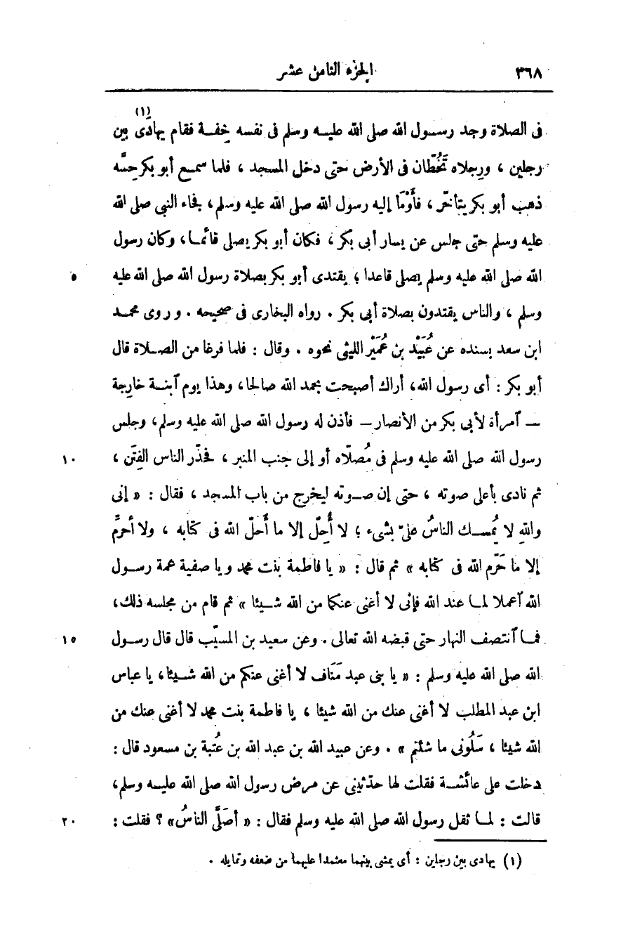 فى الصلاة وجد رسول الله صلّى الله عليه وسلّم فى نفسه خفة فقام يهادى «1» بين رجلين، ورجلاه تخطّان فى الأرض حتى دخل المسجد، فلما سمع أبو بكر حسّه ذهب أبو بكر يتأخّر، فأوما إليه رسول الله صلّى الله عليه وسلّم، فجاء النبى صلّى الله عليه وسلّم حتى جلس عن يسار أبى بكر، فكان أبو بكر يصلى قائما، وكان رسول الله صلّى الله عليه وسلّم يصلى قاعدا؛ يقتدى أبو بكر بصلاة رسول الله صلّى الله عليه وسلّم، والناس يقتدون بصلاة أبى بكر. رواه البخارى فى صحيحه. وروى محمد ابن سعد بسنده عن عبيد بن عمير الليثى نحوه. وقال: فلما فرغا من الصلاة قال أبو بكر: أى رسول الله، أراك أصبحت بحمد الله صالحا، وهذا يوم ابنة خارجة- امرأة لأبى بكر من الأنصار- فأذن له رسول الله صلّى الله عليه وسلّم، وجلس رسول الله صلّى الله عليه وسلّم فى مصلّاة أو إلى جنب المنبر، فحذّر الناس الفتن، ثم نادى بأعلى صوته، حتى إن صوته ليخرج من باب المسجد، فقال: «إنى والله لا يمسك الناس علىّ بشىء؛ لا أحلّ إلا ما أحلّ الله فى كتابه، ولا أحرّم إلا ما حرّم الله فى كتابه» ثم قال: «يا فاطمة بنت محمد ويا صفية عمة رسول الله اعملا لما عند الله فإنى لا أغنى عنكما من الله شيئا» ثم قام من مجلسه ذلك، فما انتصف النهار حتى قبضه الله تعالى. وعن سعيد بن المسيّب قال قال رسول الله صلّى الله عليه وسلّم: «يا بنى عبد مناف لا أغنى عنكم من الله شيئا، يا عباس ابن عبد المطلب لا أغنى عنك من الله شيئا، يا فاطمة بنت محمد لا أغنى عنك من الله شيئا، سلونى ما شئتم» . وعن عبيد الله بن عبد الله بن عتبة بن مسعود قال: