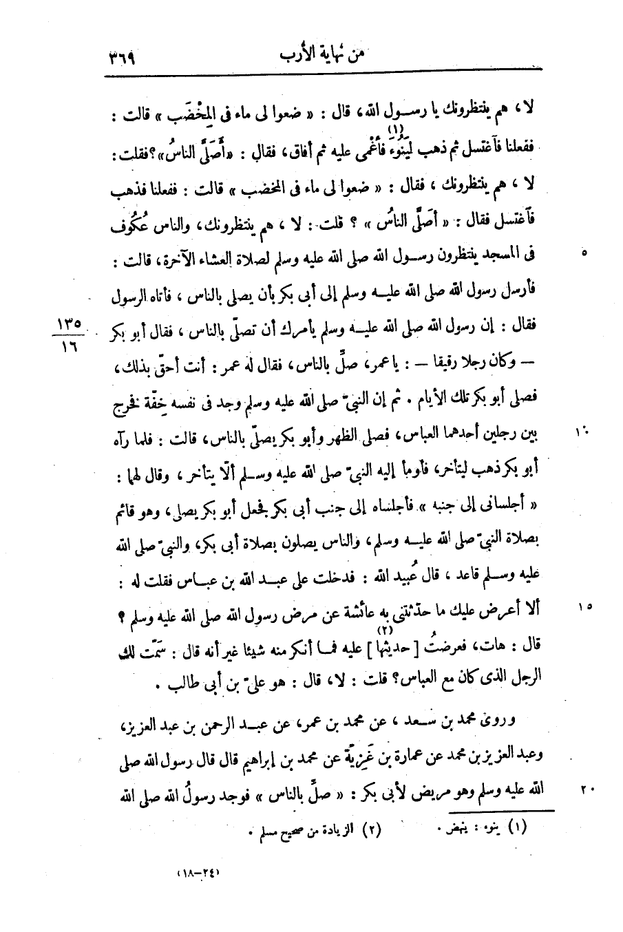 لا، هم ينتظرونك، فقال: «ضعوا لى ماء فى المخضب» قالت: ففعلنا فذهب فاغتسل فقال: «أصلّى الناس» ؟ قلت: لا، هم ينتظرونك، والناس عكوف فى المسجد ينتظرون رسول الله صلّى الله عليه وسلّم لصلاة العشاء الآخرة، قالت: