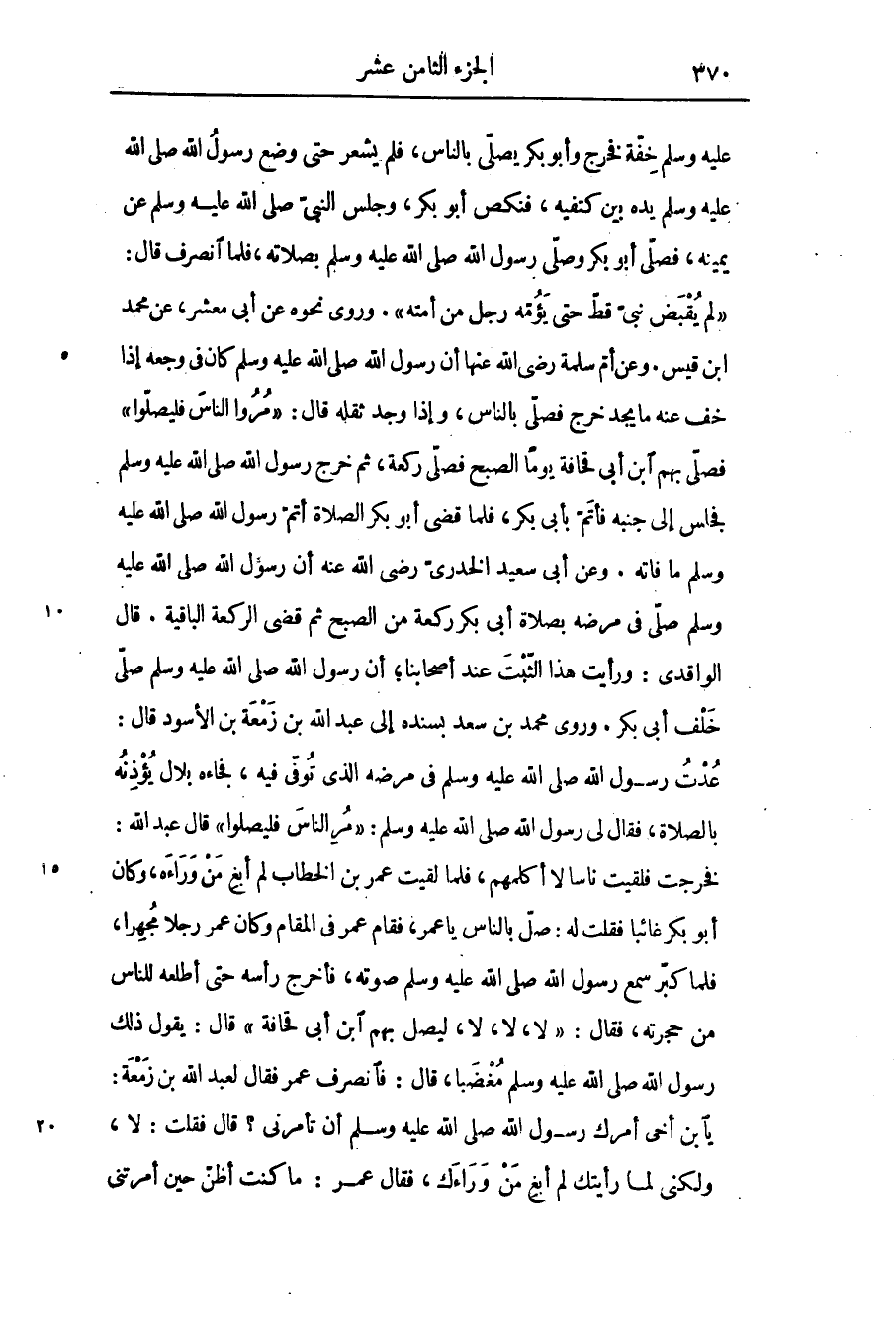 فخرجت فلقيت ناسالا أكلمهم، فلما لقيت عمر بن الخطاب لم أبغ من وراءه، وكان أبو بكر غائبا فقلت له: صلّ بالناس يا عمر، فقام عمر فى المقام وكان عمر رجلا مجهرا، فلما كبّر سمع رسول الله صلّى الله عليه وسلّم صوته، فأخرج رأسه حتى أطلعه للناس من حجرته، فقال: «لا، لا، لا، ليصل بهم ابن أبى قحافة» قال: يقول ذلك رسول الله صلّى الله عليه وسلّم مغضبا، قال: فانصرف عمر فقال لعبد الله بن زمعة: