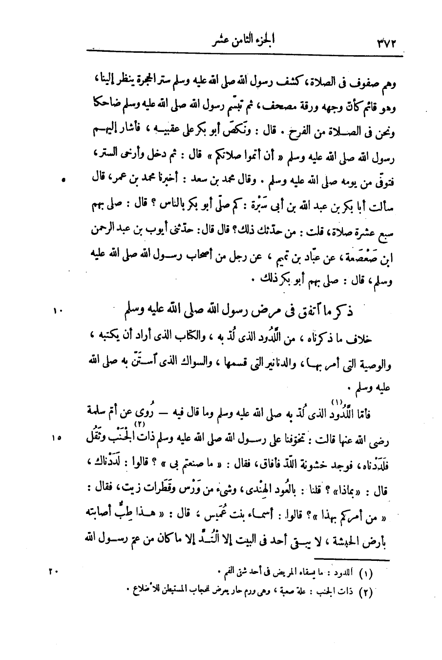 وهم صفوف فى الصلاة، كشف رسول الله صلّى الله عليه وسلّم ستر الحجرة ينظر إلينا، وهو قائم كأنّ وجهه ورقة مصحف، ثم تبسّم رسول الله صلّى الله عليه وسلّم ضاحكا ونحن فى الصلاة من الفرح. قال: ونكص أبو بكر على عقبيه، فأشار إليهم رسول الله صلّى الله عليه وسلّم «أن أتموا صلاتكم» قال: ثم دخل وأرخى الستر، فتوفّى من يومه صلّى الله عليه وسلّم. وقال محمد بن سعد: أخبرنا محمد بن عمر، قال سألت أبا بكر بن عبد الله بن أبى سبرة: كم صلّى أبو بكر بالناس؟ قال: صلّى بهم سبع عشرة صلاة، قلت: من حدّثك ذلك؟ قال قال: حدّثنى أيوب بن عبد الرحمن ابن صعصعة، عن عبّاد بن تميم، عن رجل من أصحاب رسول الله صلّى الله عليه وسلّم، قال: صلّى بهم أبو بكر ذلك.