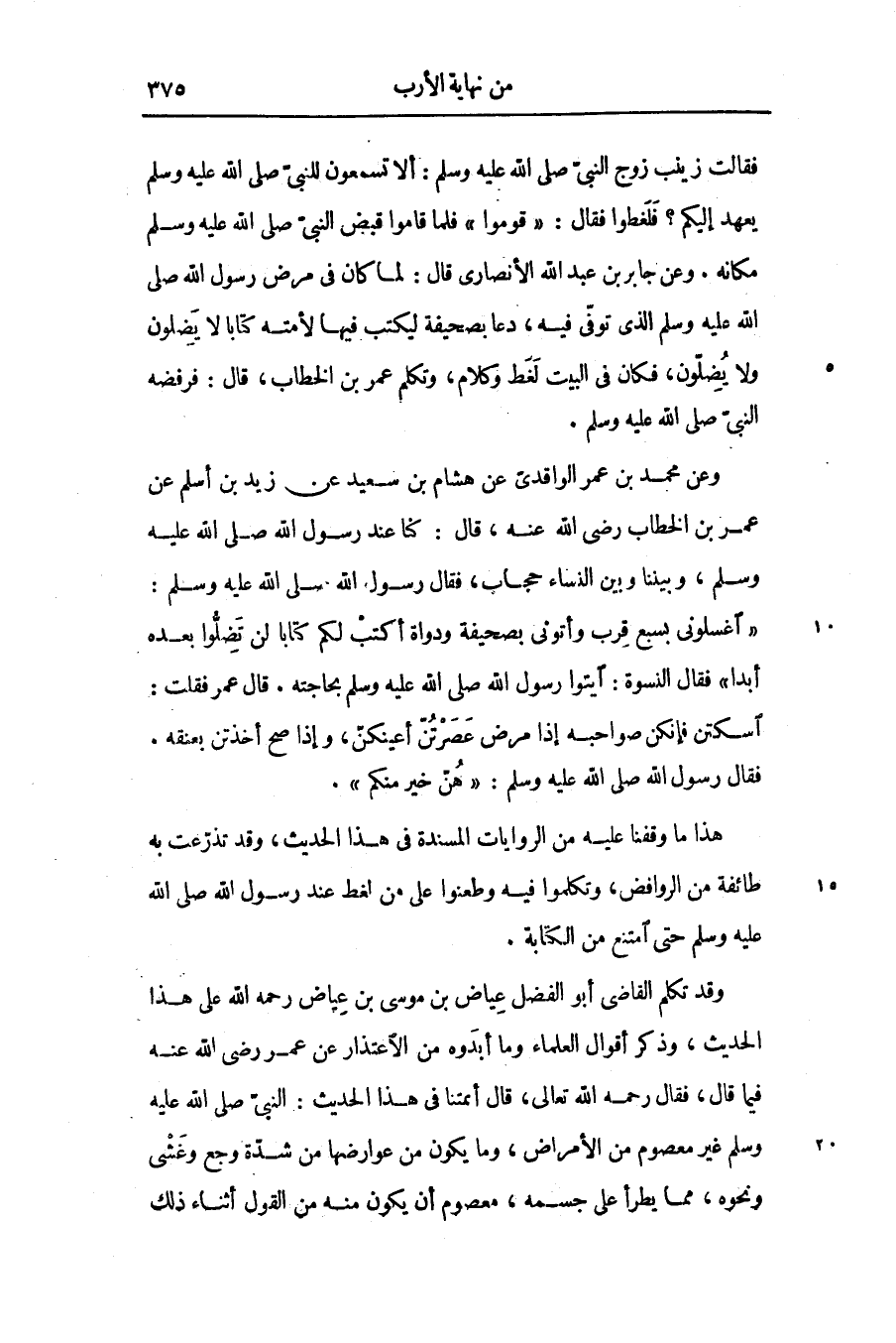 فقالت زينب زوج النبىّ صلّى الله عليه وسلّم: ألا تسمعون للنبىّ صلّى الله عليه وسلّم يعهد إليكم؟ فلغطوا فقال: «قوموا» فلما قاموا قبض النبىّ صلّى الله عليه وسلّم مكانه. وعن جابر بن عبد الله الأنصارى قال: لما كان فى مرض رسول الله صلّى الله عليه وسلّم الذى توفّى فيه، دعا بصحيفة ليكتب فيها لأمته كتابا لا يضلون ولا يضلّون، فكان فى البيت لغط وكلام، وتكلم عمر بن الخطاب، قال: فرفضه النبىّ صلّى الله عليه وسلّم.