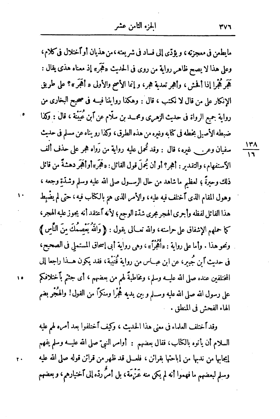 هجر هجر إذا أفحش، وأهجر تعدية هجر، وإنما الأصح والأولى «أهجر» ؟ على طريق الإنكار على من قال لا نكتب، قال: وهكذا روايتنا فيه فى صحيح البخارى من رواية جميع الرواة فى حديث الزهرى ومحمد بن سلّام عن ابن عيينة، قال: وكذا ضبطه الأصيلى بخطه فى كتابه وغيره من هذه الطرق، وكذا رويناه عن مسلم فى حديث سفيان وعن غيره، قال: وقد تحمل عليه رواية من رواه هجر على حذف ألف الاستفهام، والتقدير: أهجر؟ أو أن يحمل قول القائل: «هجر» أو أهجر دهشة من قائل ذلك وحيرة؛ لعظيم ما شاهد من حال الرسول صلّى الله عليه وسلّم وشدّة وجعه، وهول المقام الذى اختلفت فيه عليه، والأمر الذى همّ بالكتاب فيه، حتى لم يضبط هذا القائل لفظه وأجرى الهجر مجرى شدّة الوجع؛ لأنه اعتقد أنه يجوز عليه الهجر، كما حملهم الإشفاق على حراسته، والله تعالى يقول: وَاللَّهُ يَعْصِمُكَ مِنَ النَّاسِ