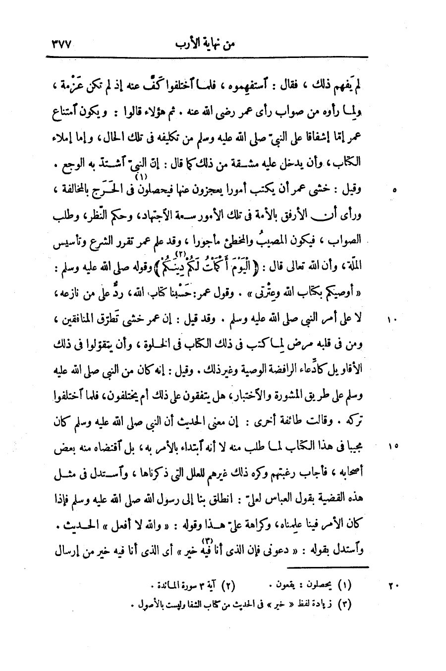 وقيل: خشى عمر أن يكتب أمورا يعجزون عنها فيحصلون «1» في الحرج بالمخالفة، ورأى أن الأرفق بالأمة فى تلك الأمور سعة الاجتهاد، وحكم النّظر، وطلب الصواب، فيكون المصيب والمخطئ مأجورا، وقد علم عمر تقرر الشرع وتأسيس الملّة، وأن الله تعالى قال: الْيَوْمَ أَكْمَلْتُ لَكُمْ دِينَكُمْ