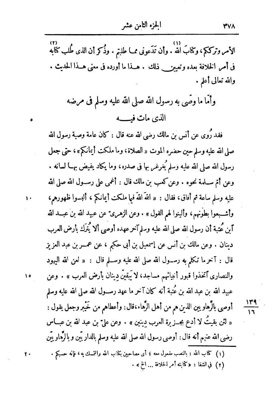 وعن أمّ سلمة نحوه. وعن كعب بن مالك قال: أغمى على رسول الله صلّى الله عليه وسلّم ساعة ثم أفاق، فقال: «الله الله فيما ملكت أيمانكم، ألبسوا ظهورهم، وأشبعوا بطونهم، وألينوا لهم القول» . وعن الزهرىّ عن عبيد الله بن عبد الله ابن عتبة أن رسول الله صلّى الله عليه وسلّم آخر عهده أوصى ألا يترك بأرض العرب دينان. وعن مالك بن أنس عن إسمعيل بن أبى حكيم، عن عمر بن عبد العزيز قال: آخر ما تكلم به رسول الله صلّى الله عليه وسلّم قال: «لعن الله اليهود والنصارى اتخذوا قبور أنبيائهم مساجد، لا يبقينّ دينان بأرض العرب» . وعن عبيد الله بن عبد الله بن عتبة أنه كان آخر ما عهد رسول الله صلّى الله عليه وسلّم أوصى بالرّهاويين الذين هم من أهل الرّهاء، قال: وأعطاهم من خيبر وجعل يقول: