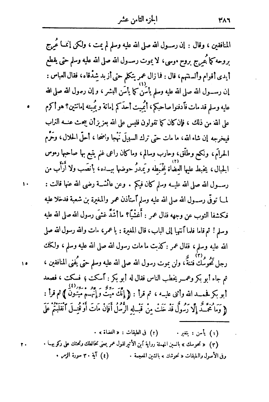 المنافقين، وقال: إن رسول الله صلّى الله عليه وسلم لم يمت، ولكن إنما عرج بروحه كما عرج بروح موسى، لا يموت رسول الله صلّى الله عليه وسلّم حتى يقطع أيدى أقوام وألسنتهم، قال: فما زال عمر يتكلم حتى أزبد شدقاه، فقال العباس:
