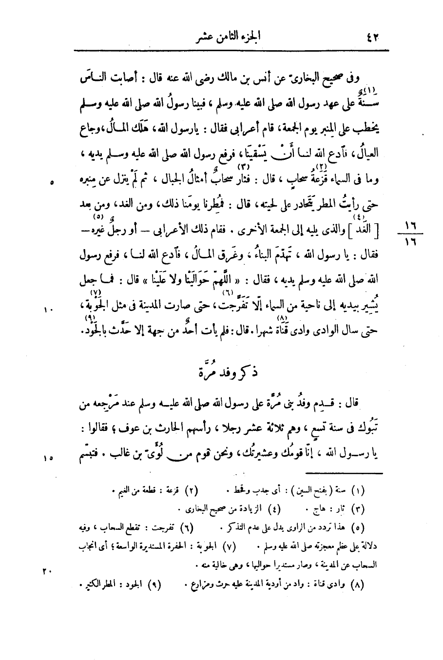 وفى صحيح البخارىّ عن أنس بن مالك رضى الله عنه قال: أصابت الناس سنة «1» على عهد رسول الله صلّى الله عليه وسلّم، فبينا رسول الله صلّى الله عليه وسلّم يخطب على المنبر يوم الجمعة، قام أعرابى فقال: يا رسول الله، هلك المال، وجاع العيال، فادع الله لنا أن يسقينا، فرفع رسول الله صلّى الله عليه وسلّم يديه، وما فى السماء قزعة «2» سحاب، قال: فثار «3» سحاب أمثال الجبال، ثم لم ينزل عن منبره حتى رأيت المطر يتحادر على لحيته، قال: فمطرنا يومنا ذلك، ومن الغد، ومن بعد [الغد «4» ] والذى يليه إلى الجمعة الأخرى. فقام ذلك الأعرابى- أو رجل غيره «5» - فقال: يا رسول الله، تهدّم البناء، وغرق المال، فادع الله لنا، فرفع رسول الله صلّى الله عليه وسلّم يديه، فقال: «اللهمّ حوالينا ولا علينا» قال: فما جعل يشير بيديه إلى ناحية من السماء إلّا تفرّجت «6» ، حتى صارت المدينة فى مثل الجوبة «7» ، حتى سال الوادى وادى قناة «8» شهرا. قال: فلم يأت أحد من جهة إلا حدّث بالجود «9» .