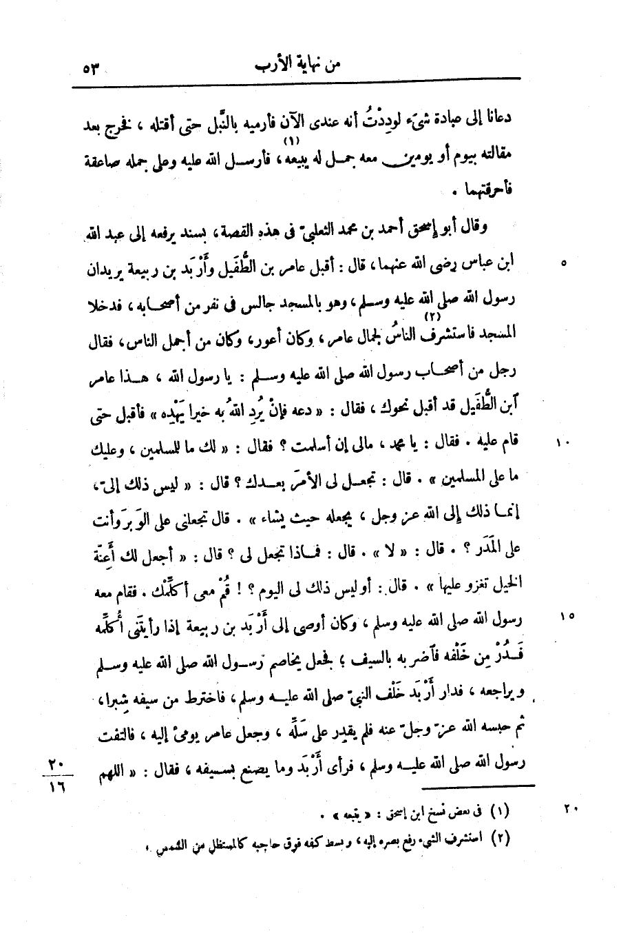 وقال أبو إسحق أحمد بن محمد الثعلبىّ فى هذه القصة، بسند يرفعه إلى عبد الله ابن عباس رضى الله عنهما، قال: أقبل عامر بن الطّفيل وأربد بن ربيعة يريدان رسول الله صلّى الله عليه وسلّم، وهو بالمسجد جالس فى نفر من أصحابه، فدخلا المسجد فاستشرف «2» الناس لجمال عامر، وكان أعور، وكان من أجمل الناس، فقال رجل من أصحاب رسول الله صلّى الله عليه وسلّم: يا رسول الله، هذا عامر ابن الطّفيل قد أقبل نحوك، فقال: «دعه فإن يرد الله به خيرا يهده» فأقبل حتى قام عليه. فقال: يا محمد، مالى إن أسلمت؟ فقال: «لك ما للمسلمين، وعليك ما على المسلمين» . قال: تجعل لى الأمر بعدك؟ قال: «ليس ذلك إلىّ، إنما ذلك إلى الله عز وجل، يجعله حيث يشاء» . قال تجعلنى على الوبر وأنت على المدر؟. قال: «لا» . قال: فماذا تجعل لى؟ قال: «أجعل لك أعنّة الخيل تغزو عليها» . قال: أو ليس ذلك لى اليوم؟! قم معى أكلّمك. فقام معه رسول الله صلّى الله عليه وسلّم، وكان أوصى إلى أربد بن ربيعة إذا رأيتنى أكلّمه فدر من خلفه فاضربه بالسيف؛ فجعل يخاصم رسول الله صلّى الله عليه وسلّم ويراجعه، فدار أربد خلف النبىّ صلّى الله عليه وسلّم، فاخترط من سيفه شبرا، ثم حبسه الله عزّ وجلّ عنه فلم يقدر على سلّه، وجعل عامر يومىء إليه، فالتفت رسول الله صلّى الله عليه وسلّم، فرأى أربد وما يصنع بسيفه، فقال: «اللهم