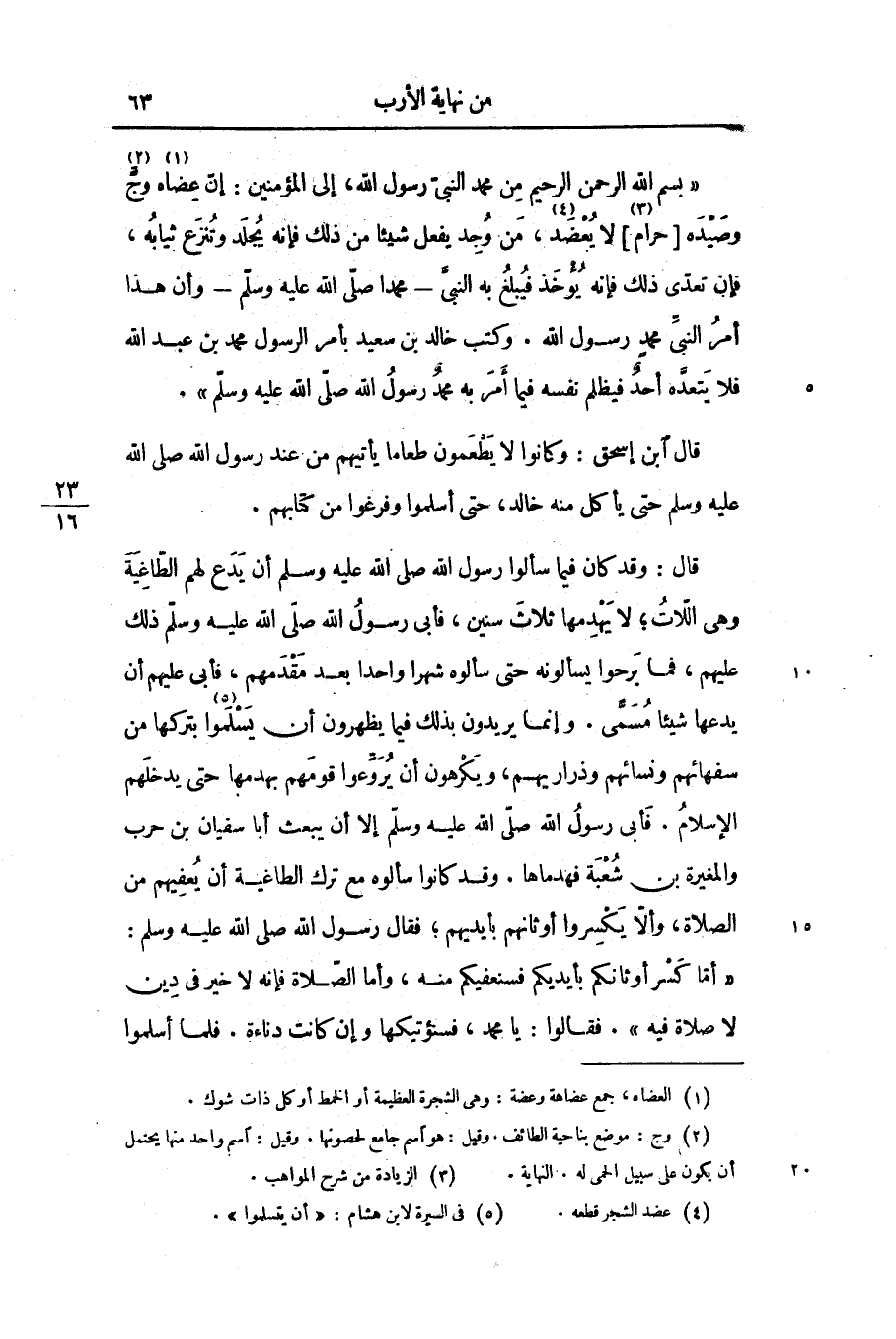 «بسم الله الرحمن الرحيم من محمد النبىّ رسول الله، إلى المؤمنين: إنّ عضاه «1» وجّ «2» وصيده [حرام «3» ] لا يعضد «4» ، من وجد يفعل شيئا من ذلك فإنه يجلد وتنزع ثيابه، فإن تعدّى ذلك فإنه يؤخذ فيبلغ به النبىّ- محمدا صلّى الله عليه وسلّم- وأن هذا أمر النبىّ محمد رسول الله. وكتب خالد بن سعيد بأمر الرسول محمد بن عبد الله فلا يتعدّه أحد فيظلم نفسه فيما أمر به محمد رسول الله صلّى الله عليه وسلّم» .