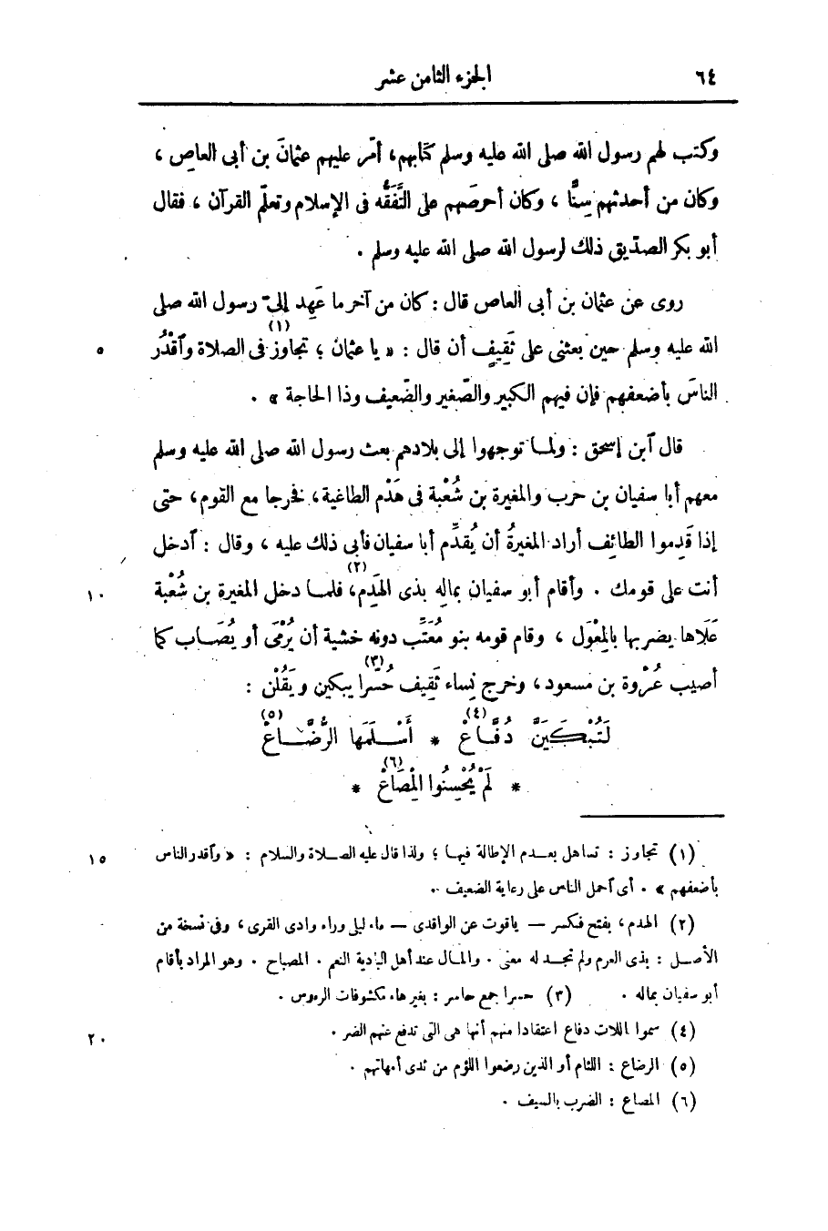 روى عن عثمان بن أبى العاص قال: كان من آخر ما عهد إلىّ رسول الله صلّى الله عليه وسلّم حين بعثنى على ثقيف أن قال: «يا عثمان؛ تجاوز «1» في الصلاة واقدر الناس بأضعفهم فإن فيهم الكبير والصّغير والضّعيف وذا الحاجة» .