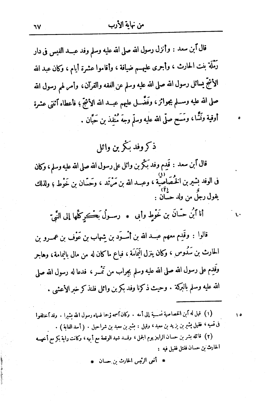 قال ابن سعد: قدم وفد بكر بن وائل على رسول الله صلّى الله عليه وسلّم، وكان فى الوفد بشير بن الحصاصيّة «1» ، وعبد الله بن مرثد، وحسّان بن خوط؛ ولذلك يقول رجل من ولد حسّان «2» :