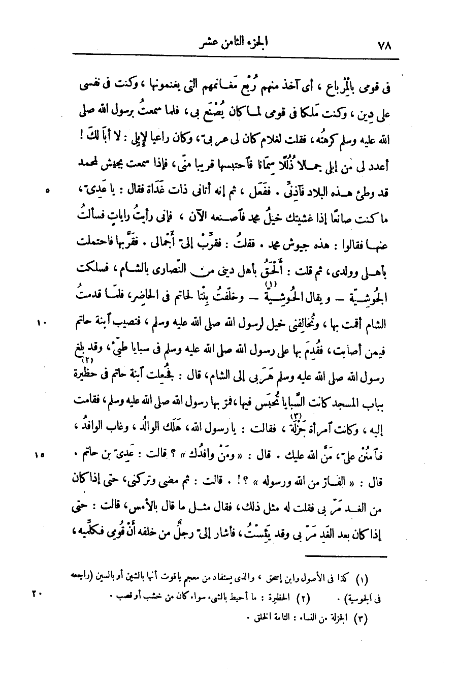 فى قومى بالمرباع، أى آخذ منهم ربع مغانمهم التى يغنمونها، وكنت فى نفسى على دين، وكنت ملكا فى قومى لما كان يصنع بى، فلما سمعت برسول الله صلّى الله عليه وسلّم كرهته، فقلت لغلام كان لى عربىّ، وكان راعيا لإبلى: لا أبا لك! أعدد لى من إبلى جمالا ذللا سمانا فاحتبسها قريبا منّى، فإذا سمعت بجيش لمحمد قد وطئ هذه البلاد فآذنىّ. ففعل، ثم إنه أتانى ذات غداة فقال: يا عدىّ، ما كنت صانعا إذا غشيتك خيل محمد فاصنعه الآن، فإنى رأيت رايات فسألت عنها فقالوا: هذه جيوش محمد. فقلت: فقرّب إلىّ أجمالى. فقرّبها فاحتملت بأهلى وولدى، ثم قلت: ألحق بأهل دينى من النّصارى بالشام، فسلكت الجوشيّة- ويقال الحوشيّة «1» - وخلّفت بنتا لحاتم فى الحاضر، فلمّا قدمت الشام أقمت بها، وتخالفنى خيل لرسول الله صلّى الله عليه وسلّم، فتصيب ابنة حاتم فيمن أصابت، فقدم بها على رسول الله صلّى الله عليه وسلّم فى سبايا طيّئ، وقد بلغ رسول الله صلّى الله عليه وسلّم هربى إلى الشام، قال: فجعلت ابنة حاتم فى حظيرة «2» بباب المسجد كانت السّبايا تحبس فيها، فمرّ بها رسول الله صلّى الله عليه وسلّم، فقامت إليه، وكانت امرأة جزلة «3» ، فقالت: يا رسول الله، هلك الوالد، وغاب الوافد، فامنن علىّ، منّ الله عليك. قال: «ومن وافدك» ؟ قالت: عدىّ بن حاتم.
