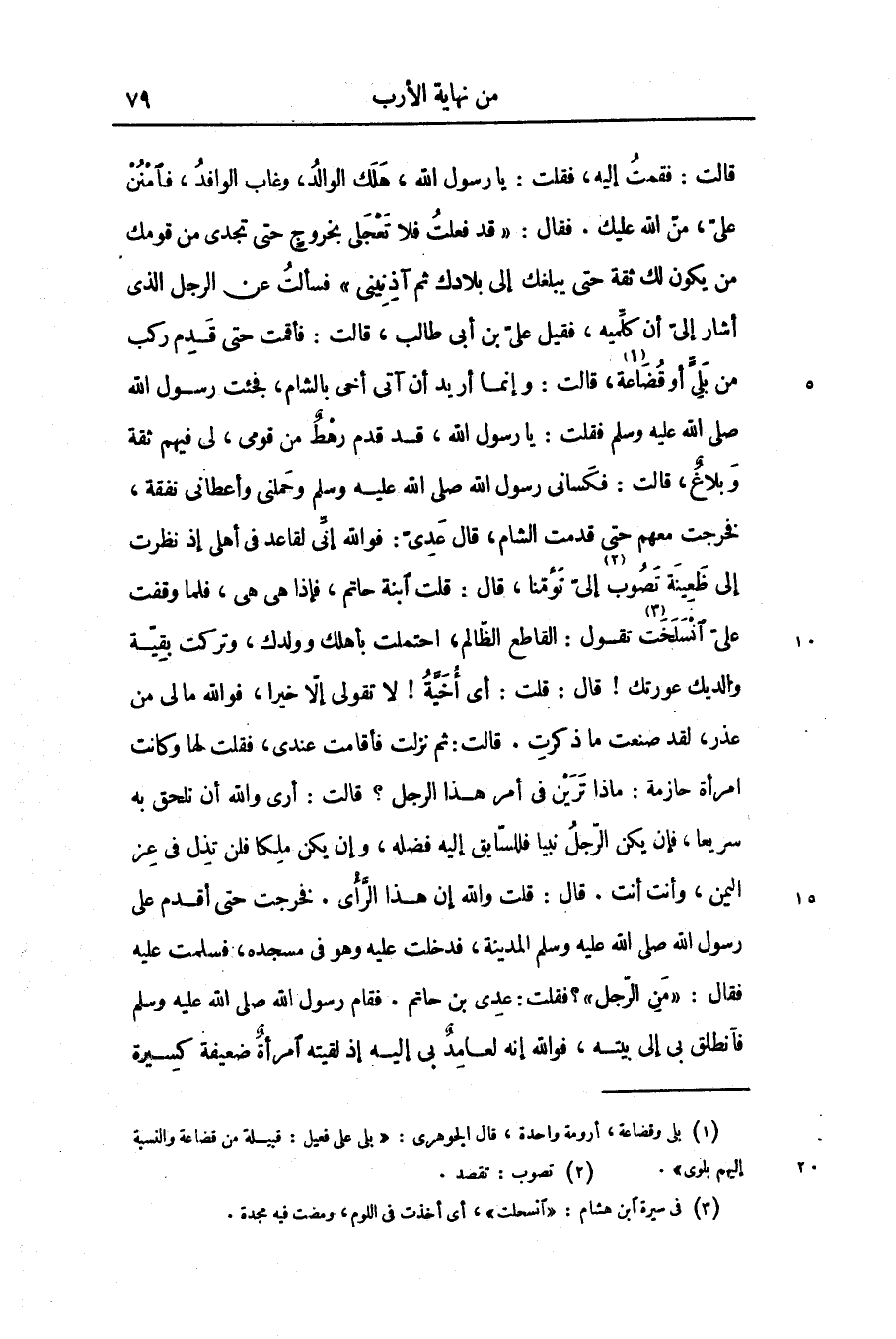 قالت: فقمت إليه، فقلت: يا رسول الله، هلك الوالد، وغاب الوافد، فامنن علىّ، منّ الله عليك. فقال: «قد فعلت فلا تعجلى بخروج حتى تجدى من قومك من يكون لك ثقة حتى يبلغك إلى بلادك ثم آذنينى» فسألت عن الرجل الذى أشار إلىّ أن كلّميه، فقيل علىّ بن أبى طالب، قالت: فأقمت حتى قدم ركب من بلىّ أو قضاعة «1» ، قالت: وإنما أريد أن آتى أخى بالشام، فجئت رسول الله صلّى الله عليه وسلّم فقلت: يا رسول الله، قد قدم رهط من قومى، لى فيهم ثقة وبلاغ، قالت: فكسانى رسول الله صلّى الله عليه وسلّم وحملنى وأعطانى نفقة، فخرجت معهم حتى قدمت الشام، قال عدىّ: فو الله إنّى لقاعد فى أهلى إذ نظرت إلى ظعينة تصوب «2» إلىّ تؤمّنا، قال: قلت ابنة حاتم، فإذا هى هى، فلما وقفت علىّ انسلخت «3» تقول: القاطع الظّالم، احتملت بأهلك وولدك، وتركت بقيّة والديك عورتك! قال: قلت: أى أخيّة! لا تقولى إلّا خيرا، فو الله ما لى من عذر، لقد صنعت ما ذكرت. قالت: ثم نزلت فأقامت عندى، فقلت لها وكانت امرأة حازمة: ماذا ترين فى أمر هذا الرجل؟ قالت: أرى والله أن نلحق به سريعا، فإن يكن الرّجل نبيا فللسّابق إليه فضله، وإن يكن ملكا فلن تذل فى عز اليمن، وأنت أنت. قال: قلت والله إن هذا الرّأى. فخرجت حتى أقدم على رسول الله صلّى الله عليه وسلّم المدينة، فدخلت عليه وهو فى مسجده، فسلمت عليه فقال: «من الرّجل» ؟ فقلت: عدى بن حاتم. فقام رسول الله صلّى الله عليه وسلّم فانطلق بى إلى بيته، فو الله إنه لعامد بى إليه إذ لقيته امرأة ضعيفة كسيرة
