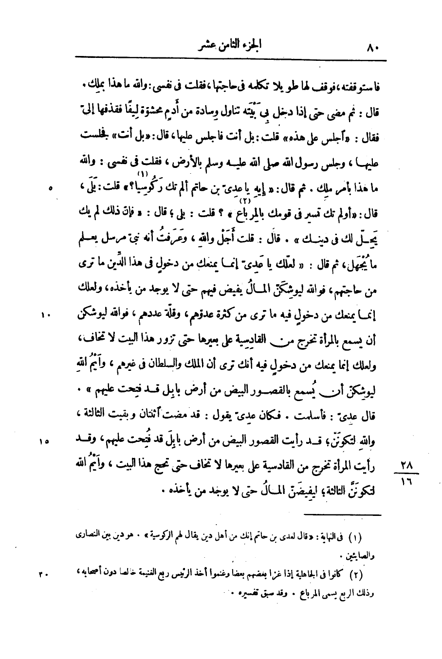 قال عدىّ: فأسلمت. فكان عدىّ يقول: قد مضت اثنتان وبقيت الثالثة، والله لتكوننّ؛ قد رأيت القصور البيض من أرض بابل قد فتحت عليهم، وقد رأيت المرأة تخرج من القادسية على بعيرها لا تخاف حتى تحج هذا البيت، وايم الله لتكوننّ الثالثة؛ ليفيضنّ المال حتى لا يوجد من يأخذه.