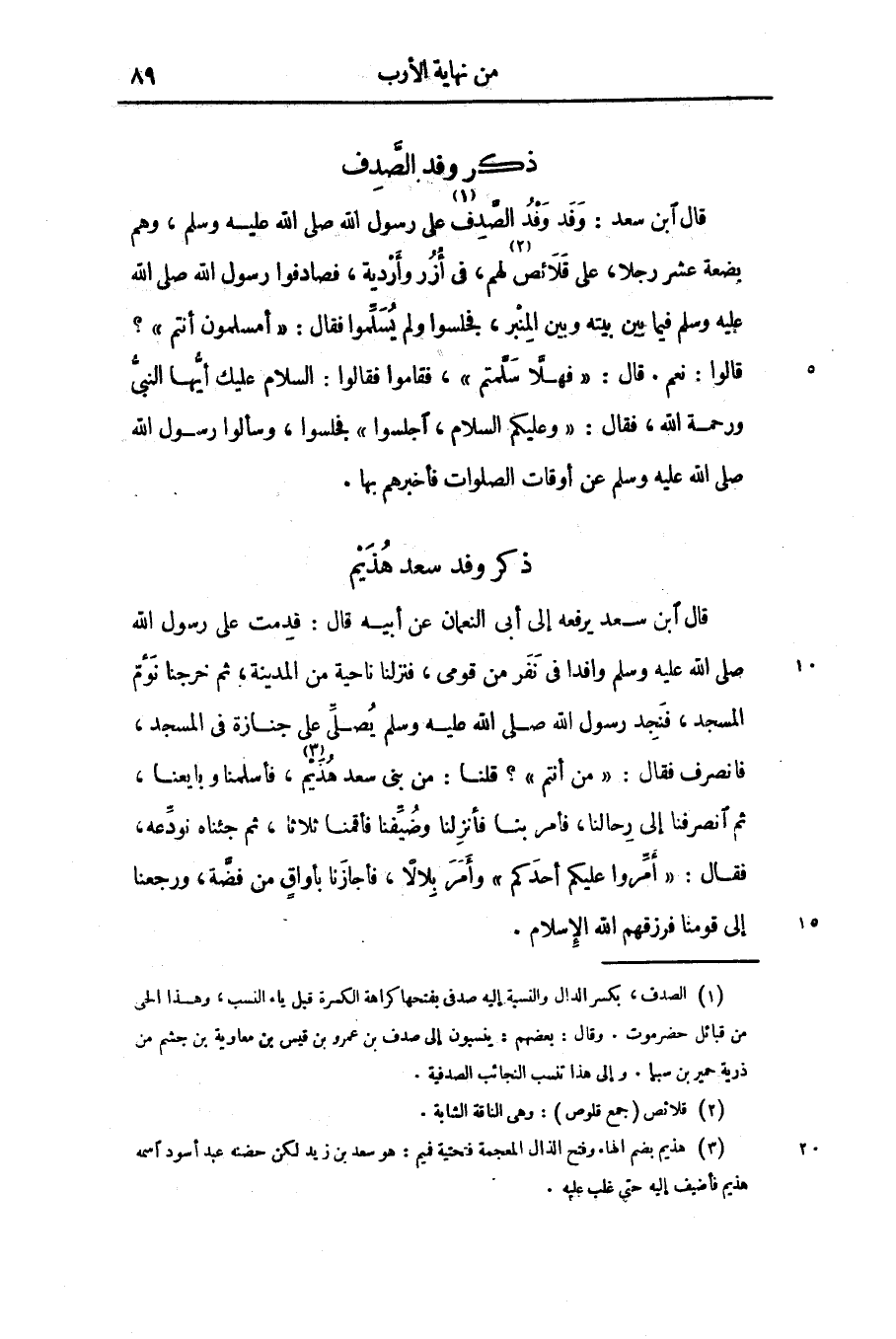 قال ابن سعد يرفعه إلى أبى النعمان عن أبيه قال: قدمت على رسول الله صلّى الله عليه وسلّم وافدا فى نفر من قومى، فنزلنا ناحية من المدينة، ثم خرجنا نؤمّ المسجد، فنجد رسول الله صلّى الله عليه وسلّم يصلّى على جنازة فى المسجد، فانصرف فقال: «من أنتم» ؟ قلنا: من بنى سعد هذيم «3» ، فأسلمنا وبايعنا، ثم انصرفنا إلى رحالنا، فأمر بنا فأنزلنا وضيّفنا فأقمنا ثلاثا، ثم جئناه نودّعه، فقال: «أمّروا عليكم أحدكم» وأمر بلالا، فأجازنا بأواق من فضّة، ورجعنا إلى قومنا فرزقهم الله الإسلام.