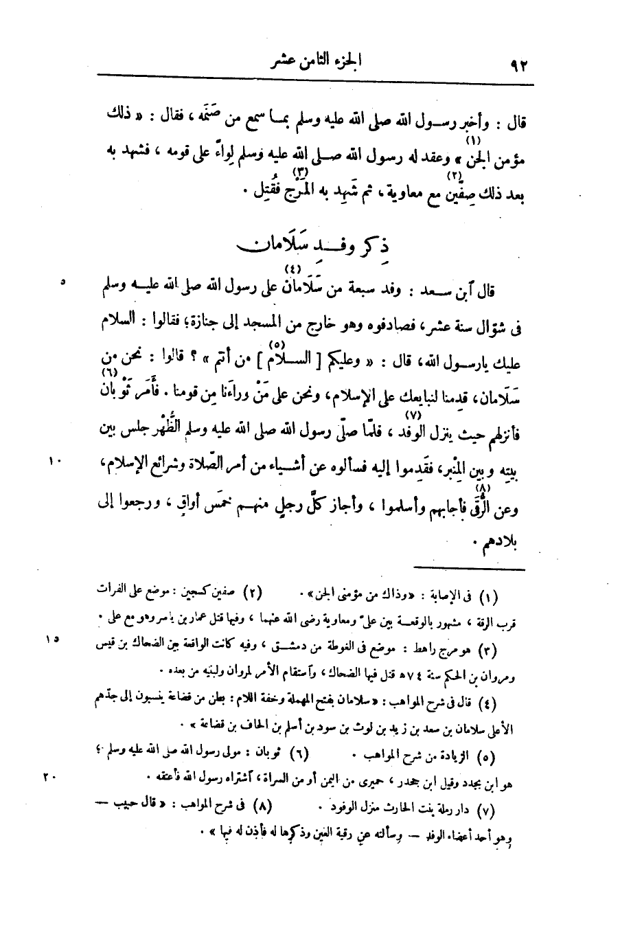 قال ابن سعد: وفد سبعة من سلامان «4» على رسول الله صلّى الله عليه وسلّم فى شوّال سنة عشر، فصادفوه وهو خارج من المسجد إلى جنازة؛ فقالوا: السلام عليك يا رسول الله، قال: «وعليكم [السلام «5» ] من أنتم» ؟ قالوا: نحن من سلامان، قدمنا لنبايعك على الإسلام، ونحن على من وراءنا من قومنا. فأمر ثوبان «6» فأنزلهم حيث ينزل الوفد «7» ، فلمّا صلّى رسول الله صلّى الله عليه وسلّم الظّهر جلس بين بيته وبين المنبر، فقدموا إليه فسألوه عن أشياء من أمر الصّلاة وشرائع الإسلام، وعن الرّقى «8» فأجابهم وأسلموا، وأجاز كلّ رجل منهم خمس أواق، ورجعوا إلى بلادهم.