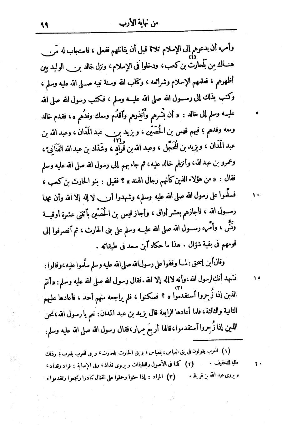 وأمره أن يدعوهم إلى الإسلام ثلاثا قبل أن يقاتلهم ففعل، فاستجاب له من هناك من بلحارث «1» بن كعب، ودخلوا فى الإسلام، ونزل خالد بن الوليد بين أظهرهم، فعلمهم الإسلام وشرائعه، وكتاب الله وسنة نبيه صلّى الله عليه وسلّم، وكتب بذلك إلى رسول الله صلّى الله عليه وسلّم، فكتب رسول الله صلّى الله عليه وسلّم إلى خالد: «أن بشّرهم وأنذرهم واقدم ومعك وفدهم» ، فقدم خالد ومعه وفدهم؛ فيهم قيس بن الحصين، ويزيد بن عبد المدان، وعبد الله بن عبد المدان، ويزيد بن المحجّل، وعبد الله بن قراد «2» ، وشدّاد بن عبد الله القنانىّ، وعمرو بن عبد الله، وأنزلهم خالد عليه، ثم جاء بهم إلى رسول الله صلّى الله عليه وسلّم فقال: «من هؤلاء الذين كأنهم رجال الهند» ؟ فقيل: بنو الحارث بن كعب، فسلّموا على رسول الله صلّى الله عليه وسلّم، وشهدوا أن لا إله إلا الله وأن محمدا رسول الله، فأجازهم بعشر أواق، وأجاز قيس بن الحصين باثنتى عشرة أوقية ونشّ، وأمّره رسول الله صلّى الله عليه وسلّم على بنى الحارث، ثم انصرفوا إلى قومهم فى بقية شوّال. هذا ما حكاه ابن سعد فى طبقاته.