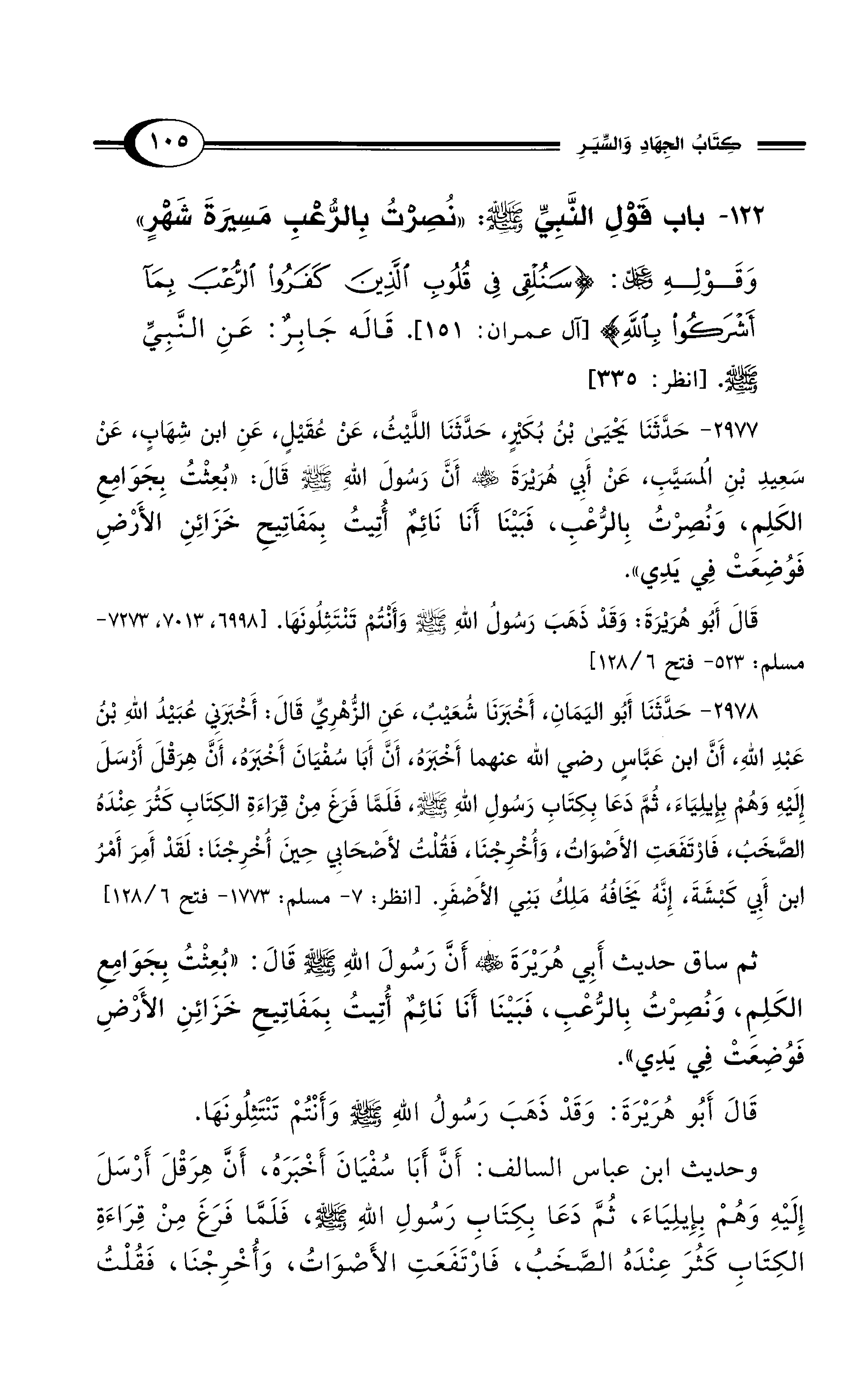2977 - حَدَّثَنَا يَحْيَى بْنُ بُكَيْرٍ، حَدَّثَنَا اللَّيْثُ، عَنْ عُقَيْلٍ، عَنِ ابْنِ شِهَابٍ، عَنْ سَعِيدِ بْنِ المُسَيَّبِ، عَنْ أَبِي هُرَيْرَةَ - رضي الله عنه - أَنَّ رَسُولَ اللهِ - صلى الله عليه وسلم - قَالَ: «بُعِثْتُ بِجَوَامِعِ الكَلِمِ، وَنُصِرْتُ بِالرُّعْبِ، فَبَيْنَا أَنَا نَائِمٌ أُتِيتُ بِمَفَاتِيحِ خَزَائِنِ الأَرْضِ، فَوُضِعَتْ فِي يَدِي».