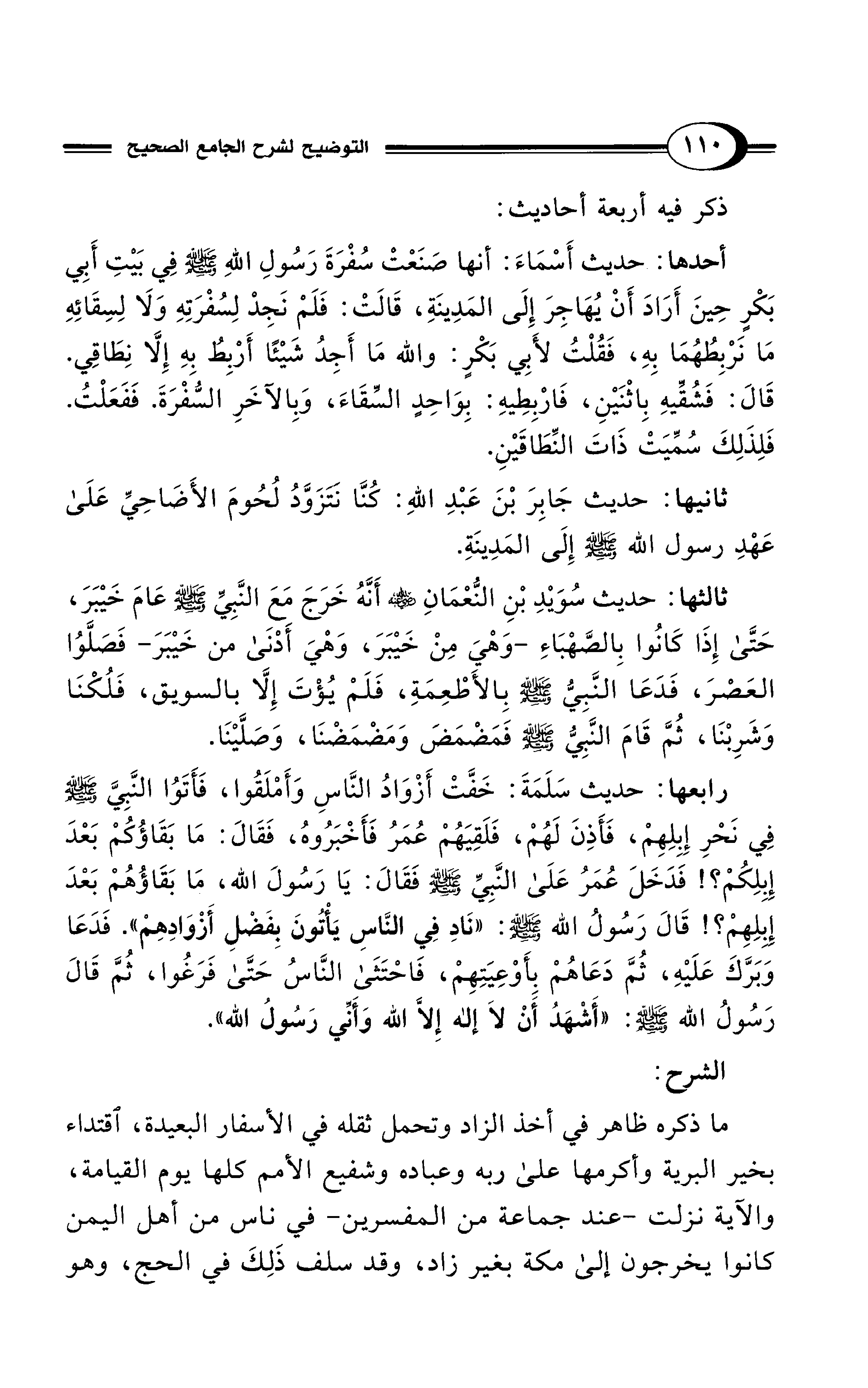 رابعها: حديث سَلَمَةَ: خَفَّتْ أَزْوَادُ النَّاسِ وَأَمْلَقُوا، فَأَتَوُا النَّبِيَّ - صلى الله عليه وسلم - فِي نَحْرِ إِبِلِهِمْ، فَأَذِنَ لَهُمْ، فَلَقِيَهُمْ عُمَرُ فَأَخْبَرُوهُ، فَقَالَ: مَا بَقَاؤُكُمْ بَعْدَ إِبِلِكُمْ؟! فَدَخَلَ عُمَرُ عَلَى النَّبِيُّ - صلى الله عليه وسلم - فَقَالَ: يَا رَسُولَ الله، مَا بَقَاؤُهُمْ بَعْدَ إبلِهِمْ؟! قَالَ رَسُولُ الله - صلى الله عليه وسلم -: "نَادِ فِي النَّاسِ يَأْتُونَ بِفَضْلِ أَزْوَادِهِمْ". فَدَعَا وَبَرَّكَ عَلَيْهِ، ثُمَّ دَعَاهُمْ بِأَوْعِيَتِهِمْ، فَاحْتَثَى النَّاسُ حَتَّى فَرَغُوا، ثُمَّ قَالَ رَسُولُ الله - صلى الله عليه وسلم -: "أَشْهَدُ أَنْ لاَ إله إِلاَّ الله وَأَنِّي رَسُولُ الله".