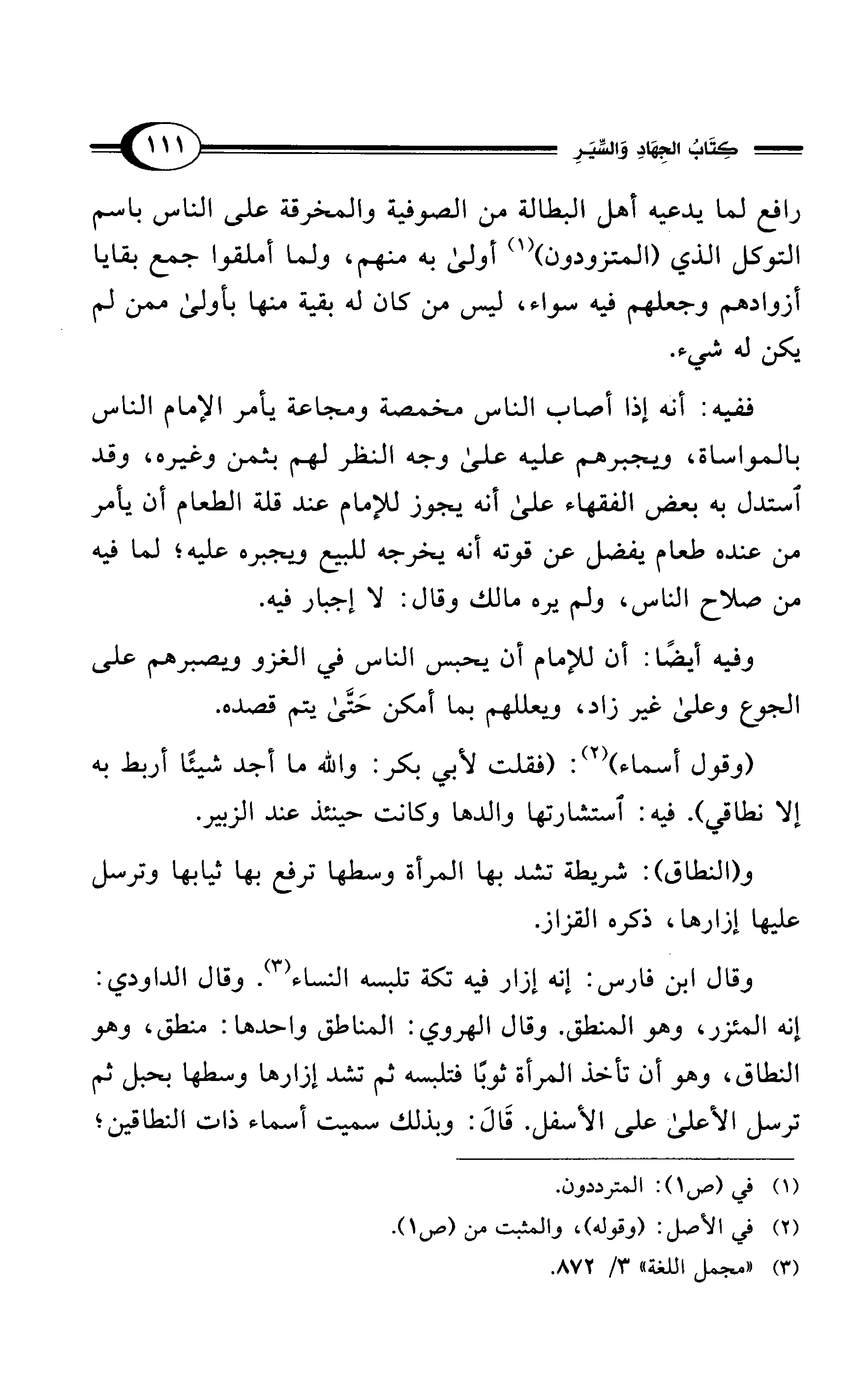 رافع لما يدعيه أهل البطالة من الصوفية والمخرقة على الناس باسم التوكل الذي (المتزودون) (¬1) أولى به منهم، ولما أملقوا جمع بقايا أزوادهم وجعلهم فيه سواء، ليس من كان له بقية منها بأولى ممن لم يكن له شيء.