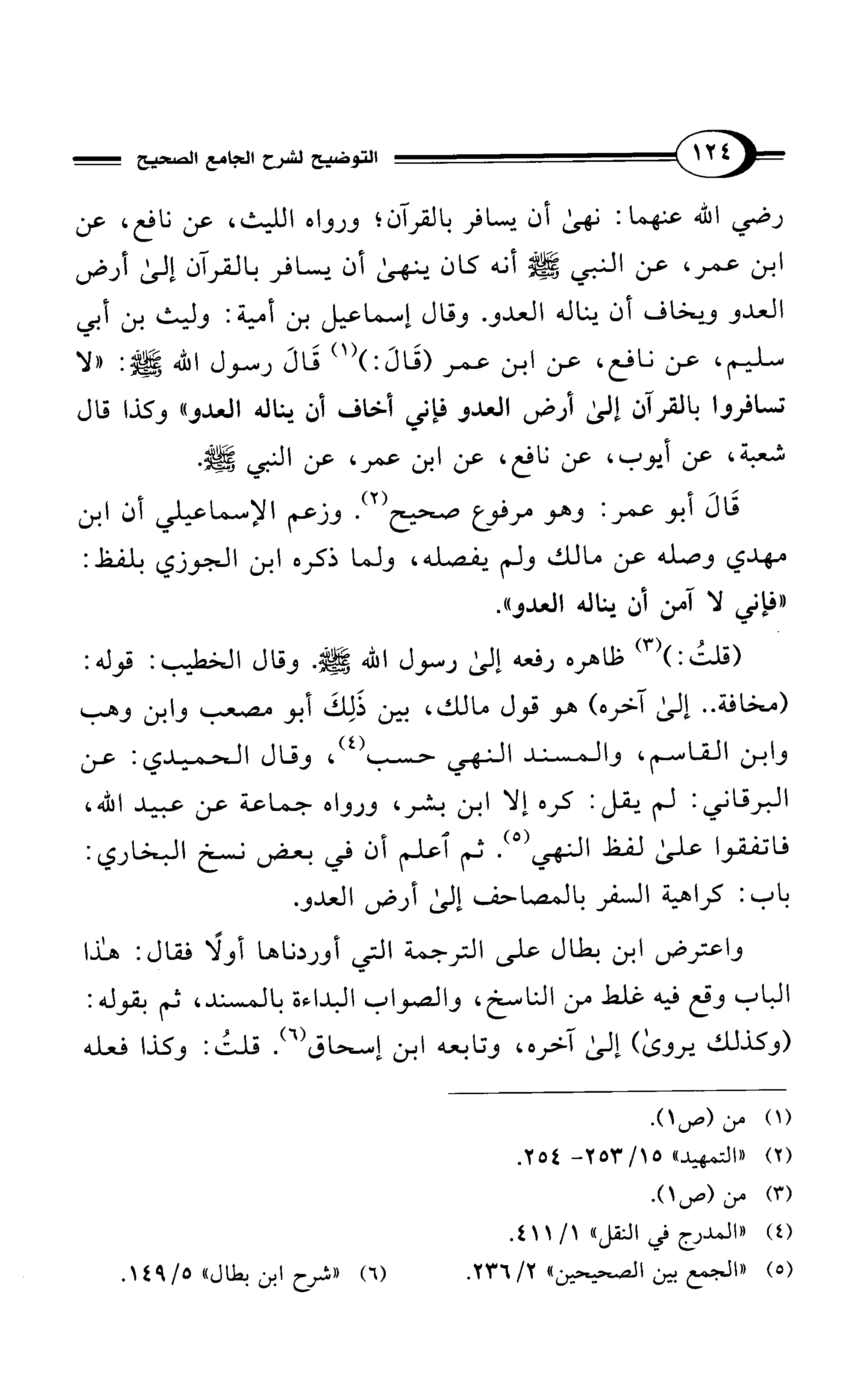 - رضي الله عنهما -: نهى أن يسافر بالقرآن؛ ورواه الليث، عن نافع، عن ابن عمر، عن النبي - صلى الله عليه وسلم - أنه كان ينهى أن يسافر بالقرآن إلى أرض العدو ويخاف أن يناله العدو. وقال إسماعيل بن أمية: وليث بن أبي سليم، عن نافع، عن ابن عمر (قَالَ:) (¬1) قَالَ رسول الله - صلى الله عليه وسلم -: "لا تسافروا بالقرآن إلى أرض العدو فإني أخاف أن يناله العدو" وكذا قال شعبة، عن أيوب، عن نافع، عن ابن عمر، عن النبي - صلى الله عليه وسلم -.