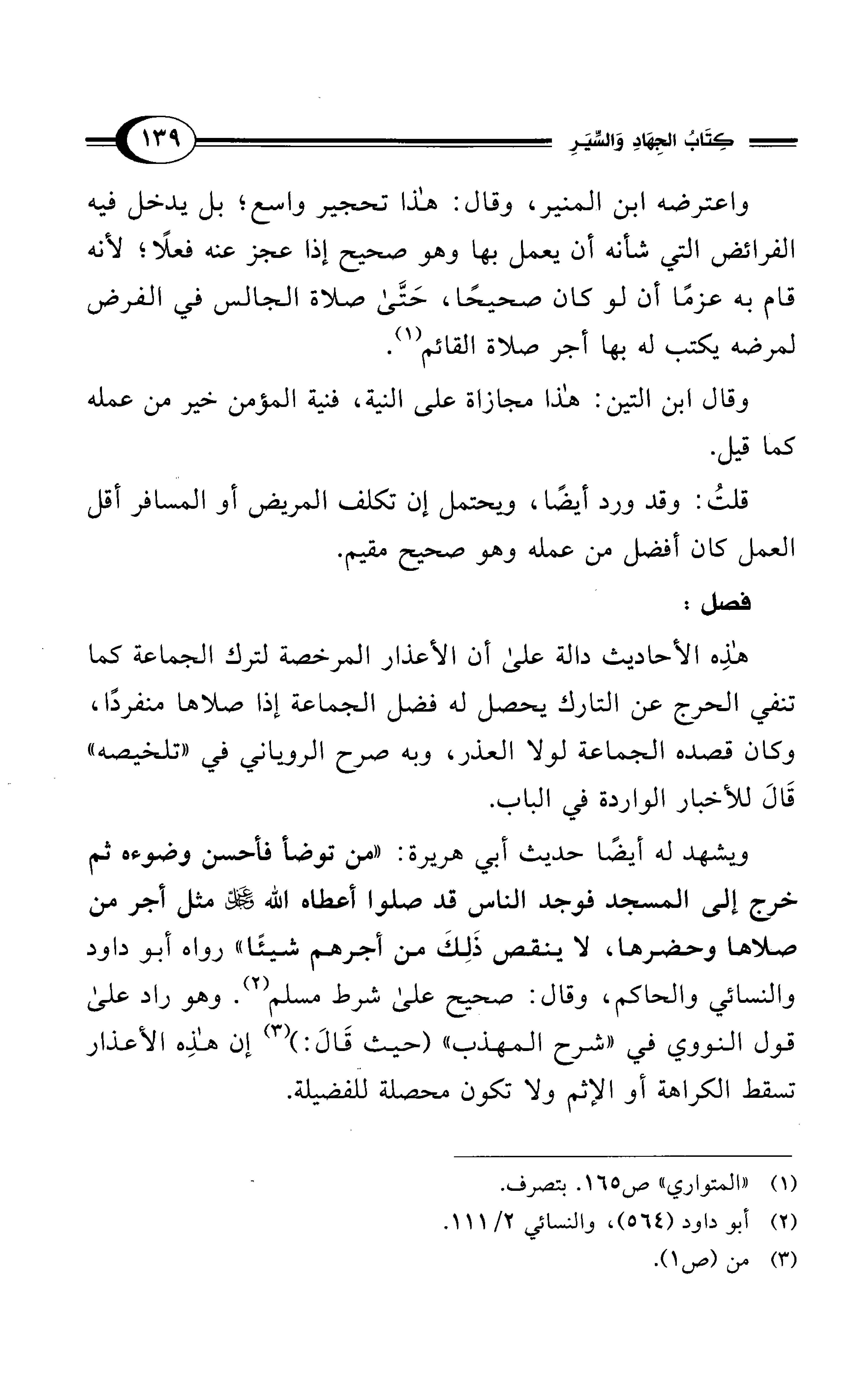 ويشهد له أيضًا حديث أبي هريرة: "من توضأ فأحسن وضوءه ثم خرج إلى المسجد فوجد الناس قد صلوا أعطاه الله -عَزَّ وَجَلَّ- مثل أجر من صلاها وحضرها, لا ينقص ذَلِكَ من أجرهم شيئًا" رواه أبو داود والنسائي والحاكم، وقال: صحيح على شرط مسلم (¬2). وهو راد على قول النووي في "شرح المهذب" (حيث قَالَ:) (¬3) إن هذِه الأعذار تسقط الكراهة أو الإثم ولا تكون محصلة للفضيلة.