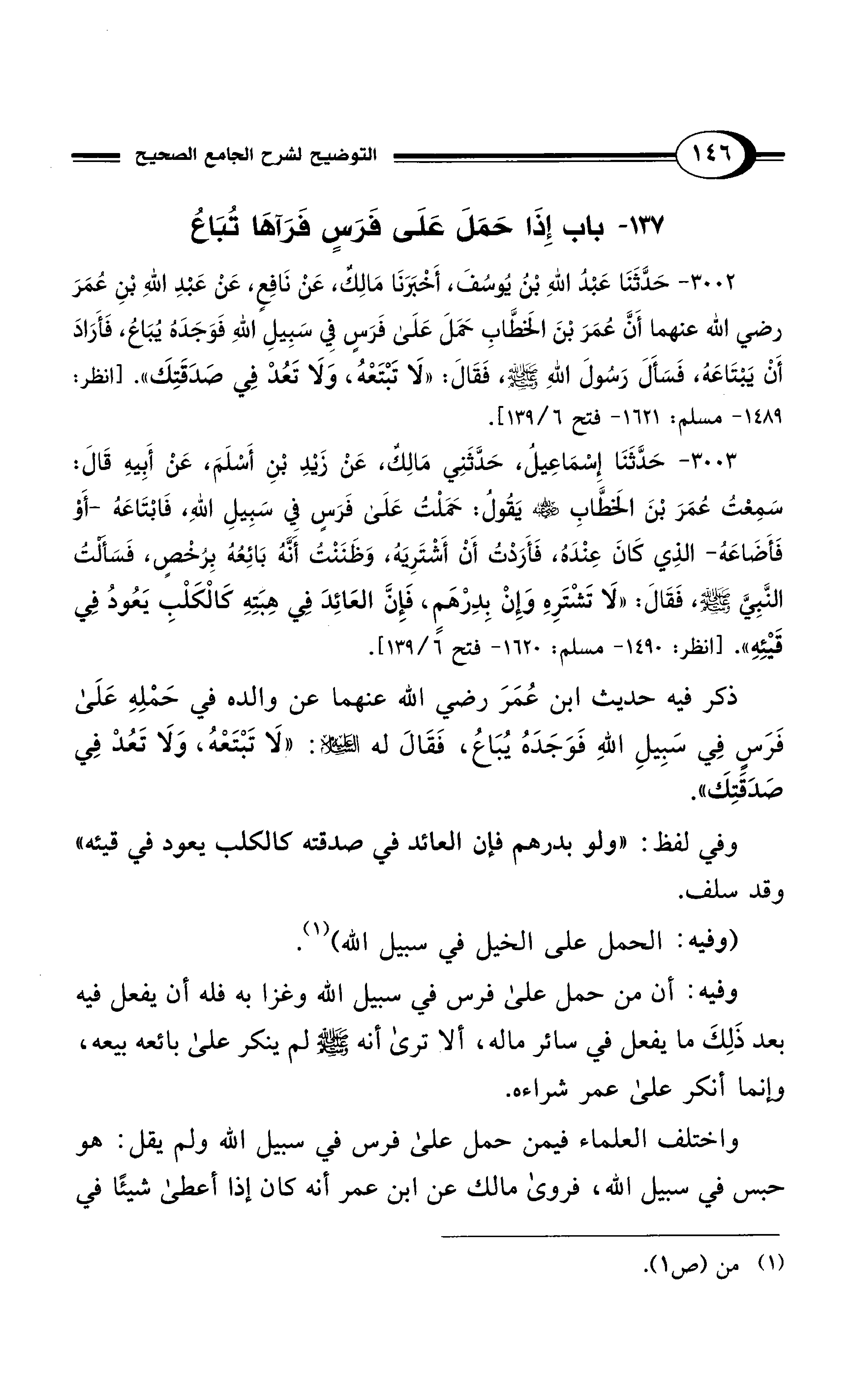 3002 - حَدَّثَنَا عَبْدُ اللهِ بْنُ يُوسُفَ، أَخْبَرَنَا مَالِكٌ، عَنْ نَافِعٍ، عَنْ عَبْدِ اللهِ بْنِ عُمَرَ - رضي الله عنهما - أَنَّ عُمَرَ بْنَ الْخَطَّابِ حَمَلَ عَلَى فَرَسٍ فِي سَبِيلِ اللهِ فَوَجَدَهُ يُبَاعُ، فَأَرَادَ أَنْ يَبْتَاعَهُ، فَسَأَلَ رَسُولَ اللهِ - صلى الله عليه وسلم - فَقَالَ: «لاَ تَبْتَعْهُ، وَلاَ تَعُدْ فِي صَدَقَتِكَ». [انظر: 1489 - مسلم: 1621 - فتح 6/ 139].