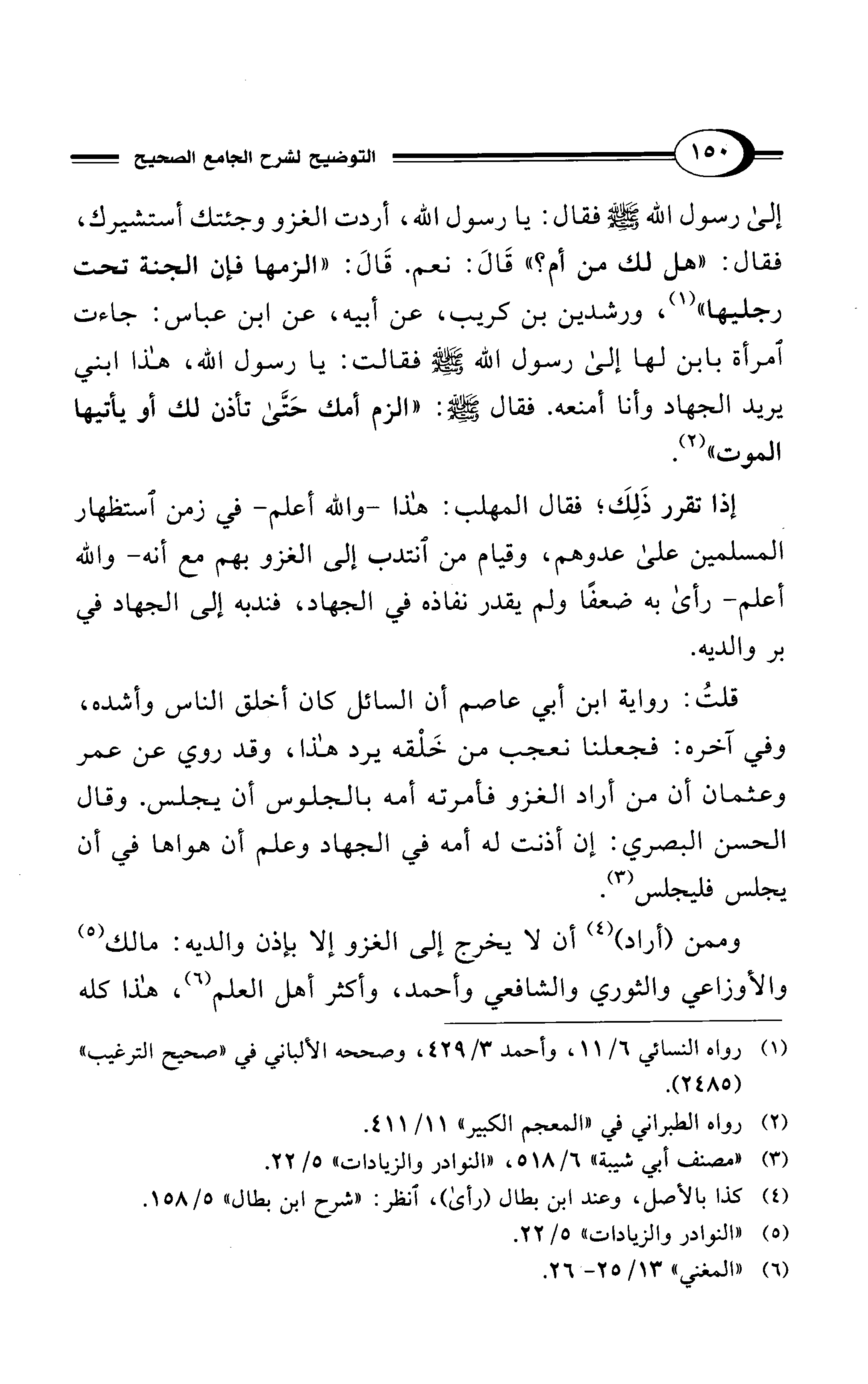 قلتُ: رواية ابن أبي عاصم أن السائل كان أخلق الناس وأشده، وفي آخره: فجعلنا نعجب من خَلْقه يرد هذا، وقد روي عن عمر وعثمان أن من أراد الغزو فأمرته أمه بالجلوس أن يجلس. وقال الحسن البصري: إن أذنت له أمه في الجهاد وعلم أن هواها في أن يجلس فليجلس (¬3).