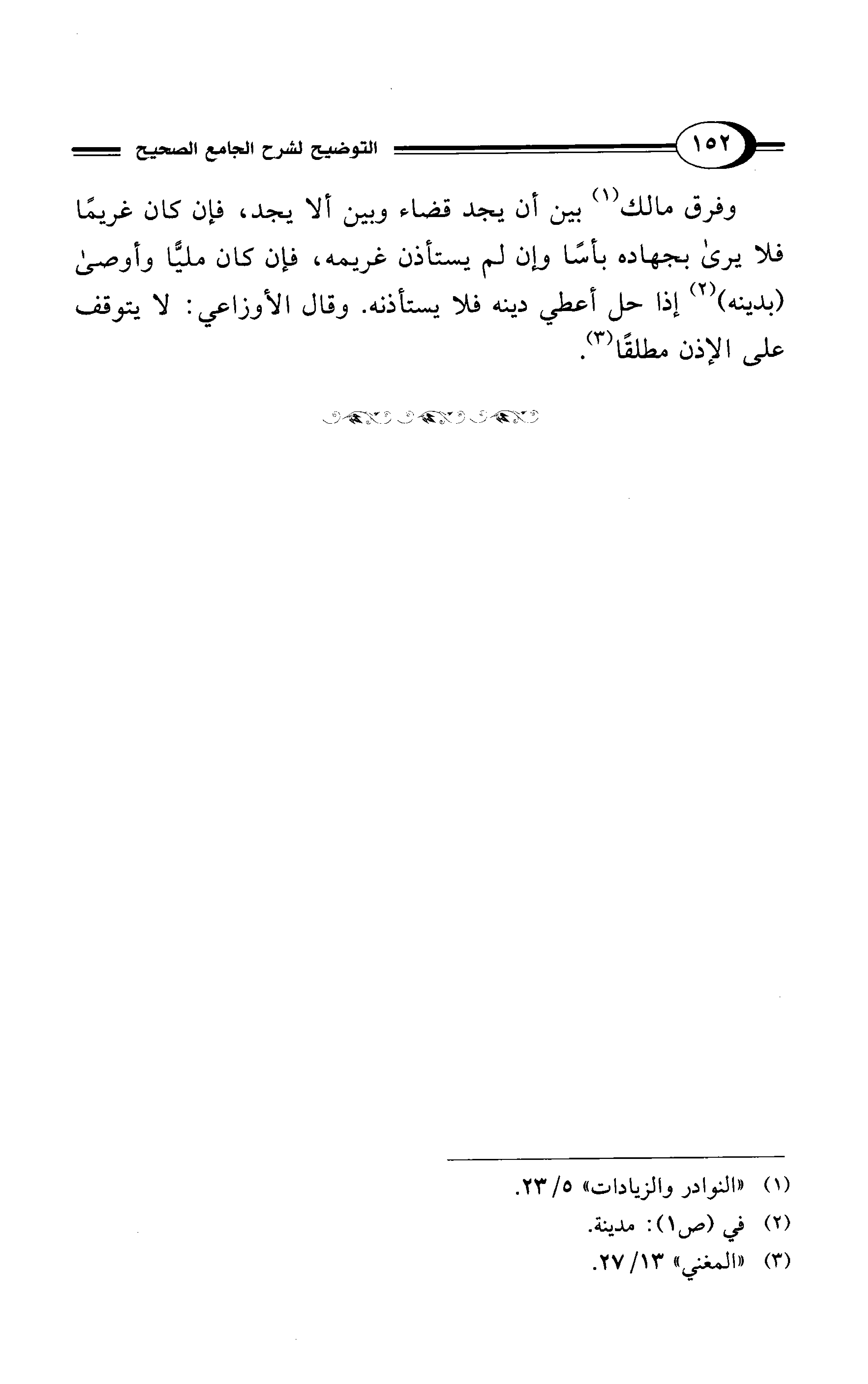 وفرق مالك (¬1) بين أن يجد قضاء وبين ألا يجد، فإن كان غريمًا فلا يرى بجهاده بأسًا وإن لم يستأذن غريمه، فإن كان مليًّا وأوصى (بدينه) (¬2) إذا حل أعطي دينه فلا يستأذنه. وقال الأوزاعي: لا يتوقف على الإذن مطلقًا (¬3).