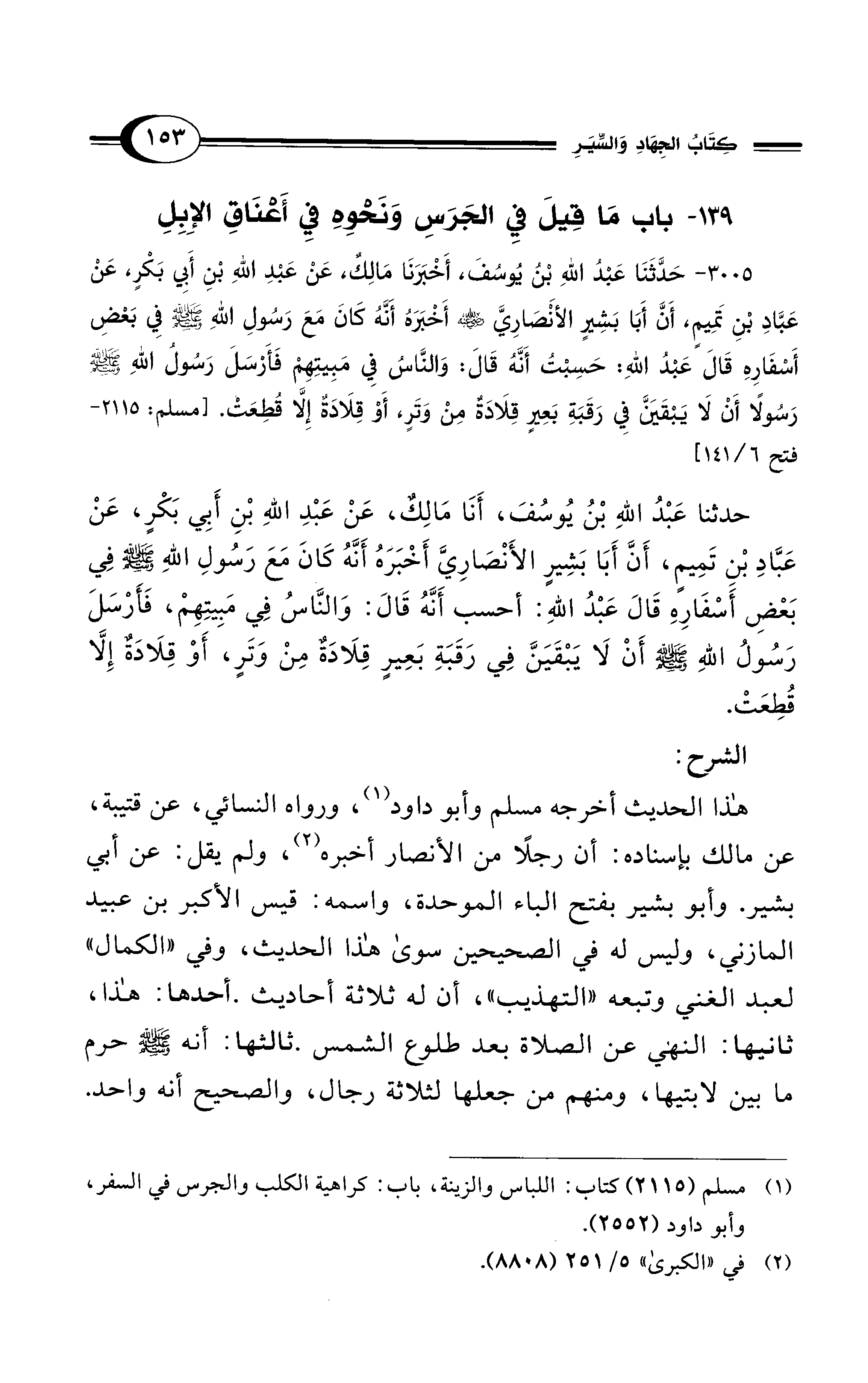 3005 - حَدَّثَنَا عَبْدُ اللهِ بْنُ يُوسُفَ، أَخْبَرَنَا مَالِكٌ، عَنْ عَبْدِ اللهِ بْنِ أَبِي بَكْرٍ، عَنْ عَبَّادِ بْنِ تَمِيمٍ، أَنَّ أَبَا بَشِيرٍ الأَنْصَارِيَّ - رضي الله عنه - أَخْبَرَهُ أَنَّهُ كَانَ مَعَ رَسُولِ اللهِ - صلى الله عليه وسلم - فِي بَعْضِ أَسْفَارِهِ قَالَ عَبْدُ اللهِ: حَسِبْتُ أَنَّهُ قَالَ: وَالنَّاسُ في مَبِيتِهِمْ، فَأَرْسَلَ رَسُولُ اللهِ - صلى الله عليه وسلم - رَسُولاً أَنْ لاَ يَبْقَيَنَّ فِي رَقَبَةِ بَعِيرٍ قِلاَدَةٌ مِنْ وَتَرٍ أَوْ قِلاَدَةٌ إِلاَّ قُطِعَتْ. [مسلم: 2115 -
